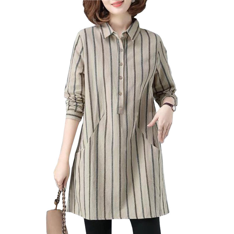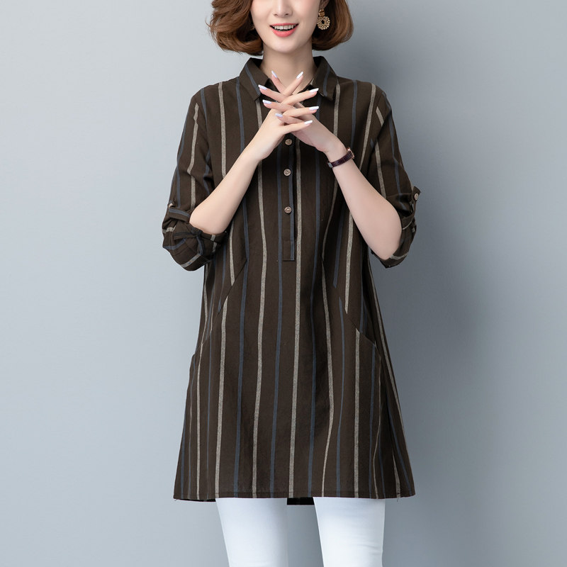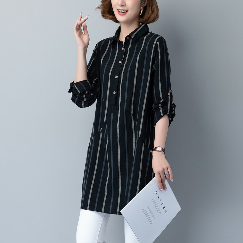 春装女2025年新款 大码女装韩版宽松条纹衬衣女 中长款衬衫上衣女