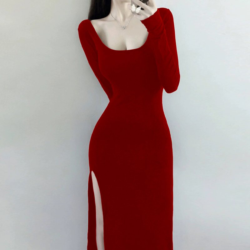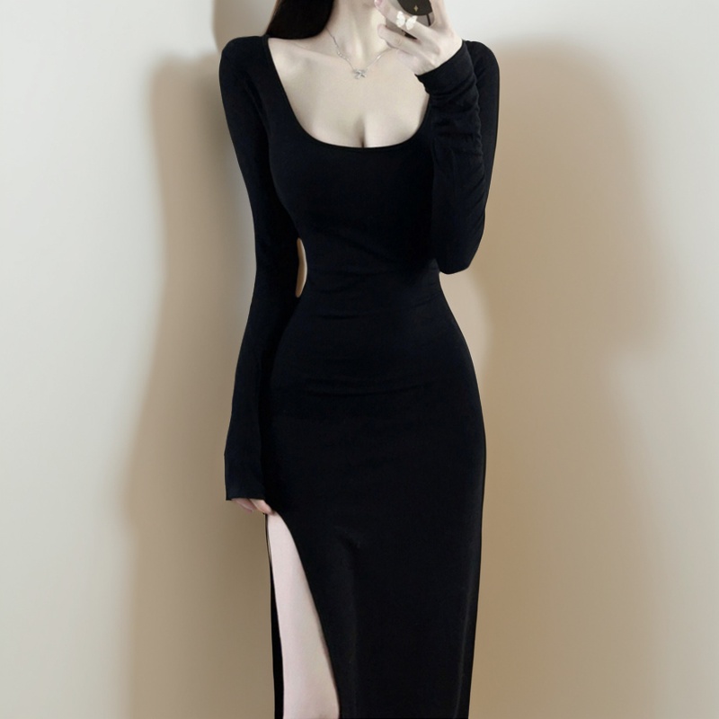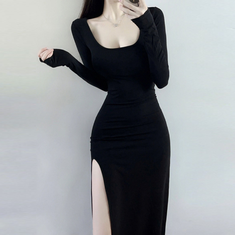 热辣性感紧身侧开叉连衣裙女超显身材长袖御姐纯欲小妈风包臀长裙