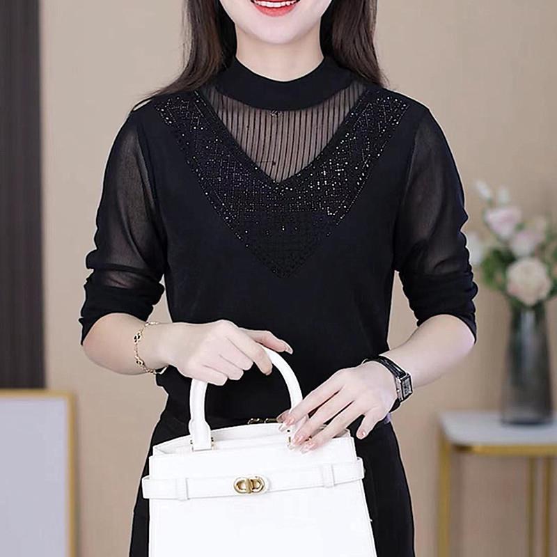 秋冬打底内搭花边领网纱衫女新款加绒洋气烫钻T恤镂空蕾丝1007k