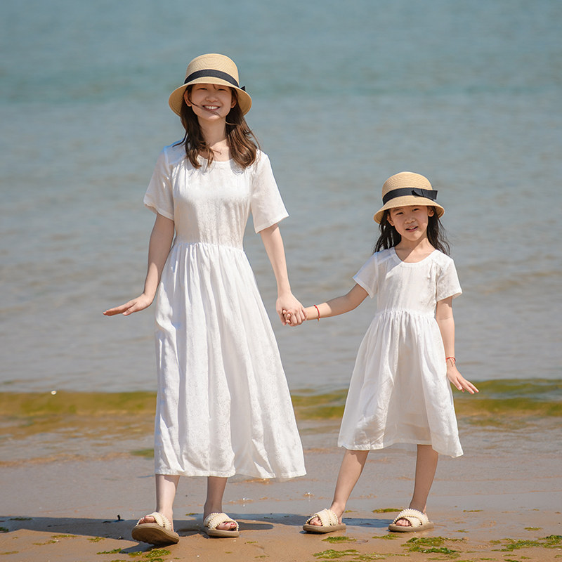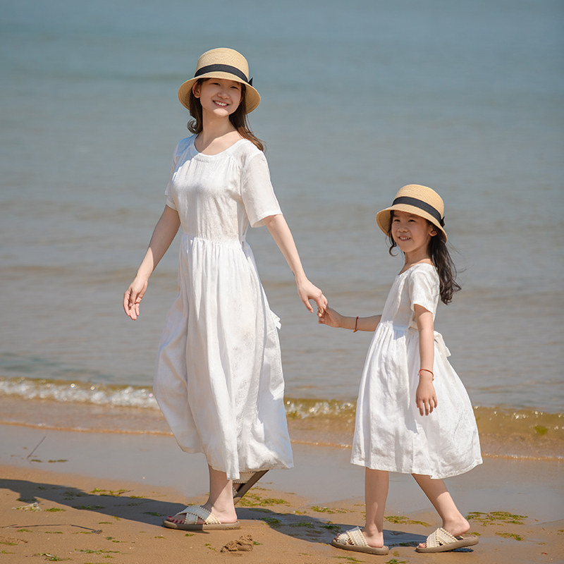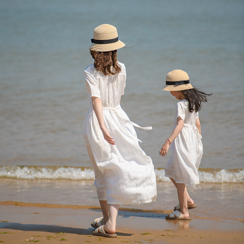 小乐往原创亲子装80课 夏女童海边亲子照度假白色文艺连衣裙母女