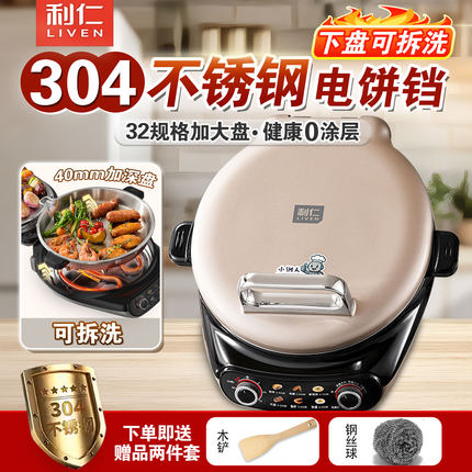 利仁电饼铛可拆洗304不锈钢家用双面加热0涂层烙饼2025新款小钢人