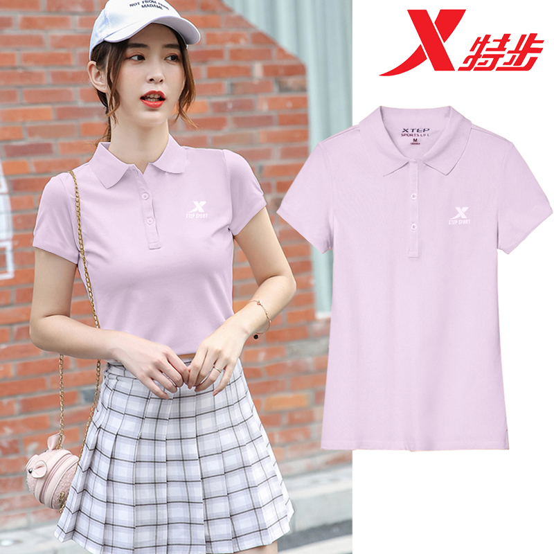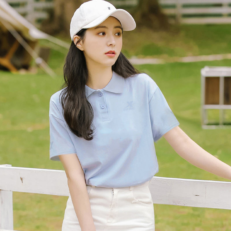 特步短袖女夏季宽松翻领体恤透气速干运动T恤休闲蓝色女士polo衫