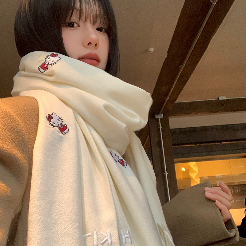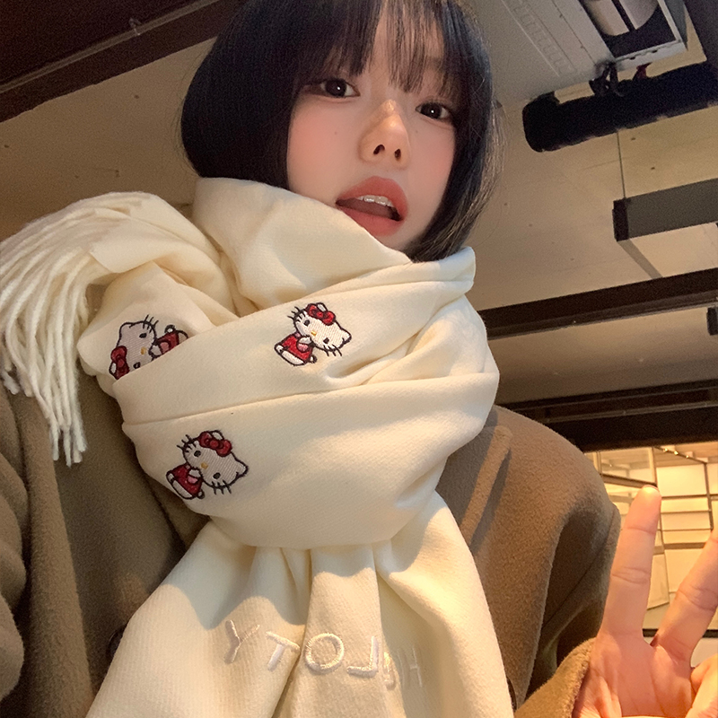 正版授权Hellokitty刺绣仿羊绒围巾女2025年冬季保暖护颈学生围脖