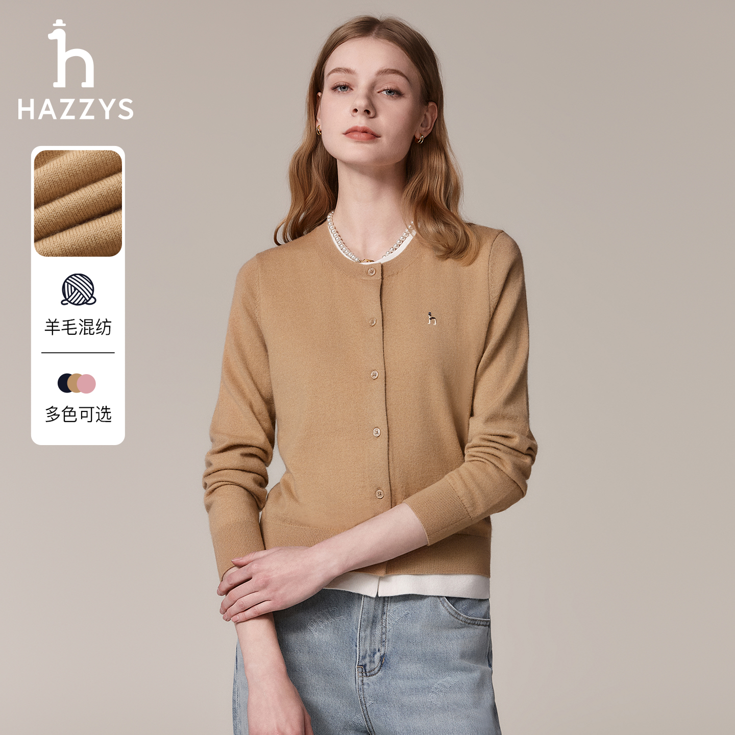 Hazzys哈吉斯羊毛开衫女秋冬季正品时尚女士针织衫假两件拼接上衣