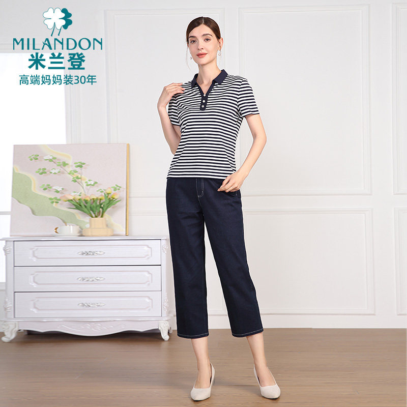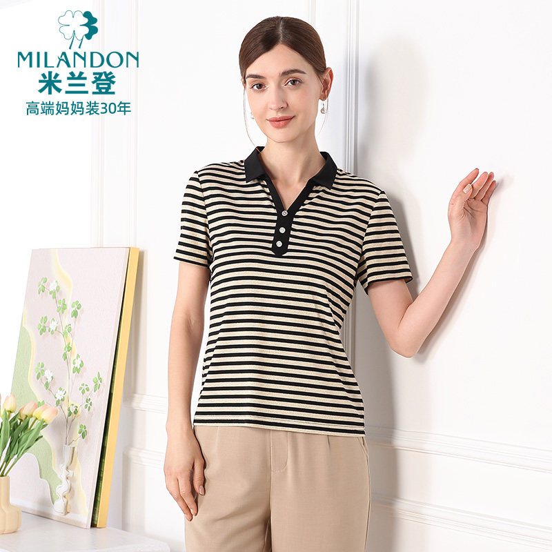 米兰登中老年妈妈装2025年夏季新款翻领时尚条纹T恤衫女短袖休闲
