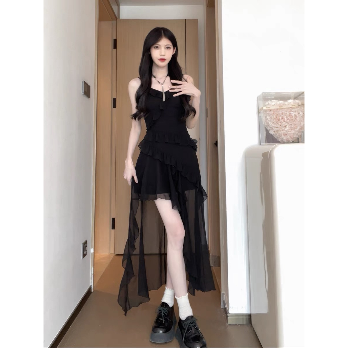 时尚休闲蝴蝶裙碎花不规则吊带裙2025夏季连衣裙新款荷叶边裙子