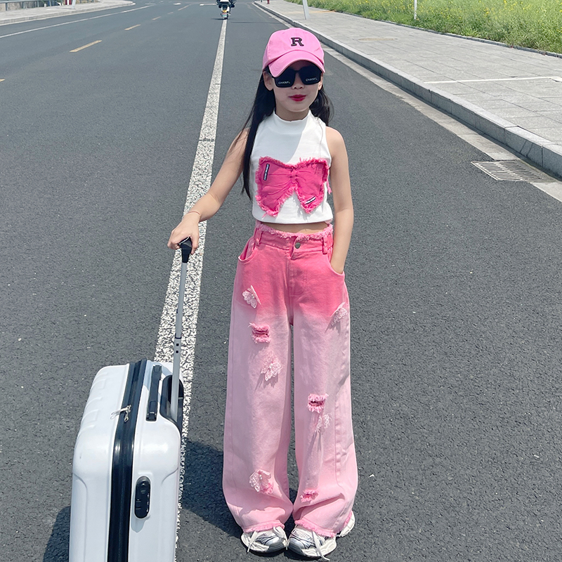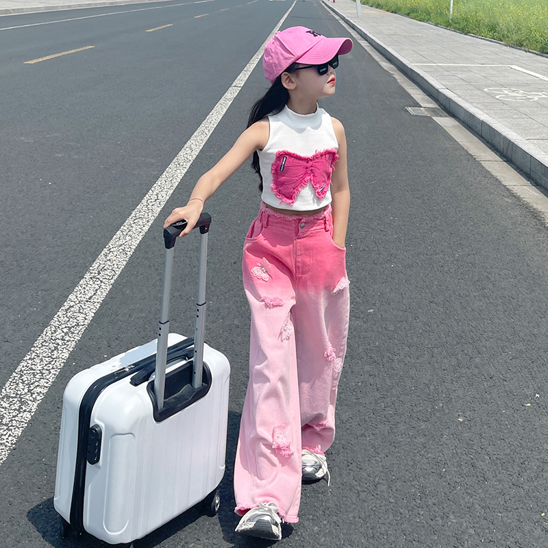 女童破洞渐变牛仔裤夏季2025新款中大童薄款网红时尚宽松高腰裤潮