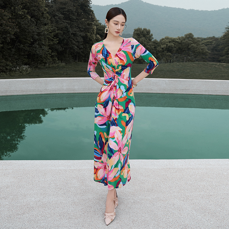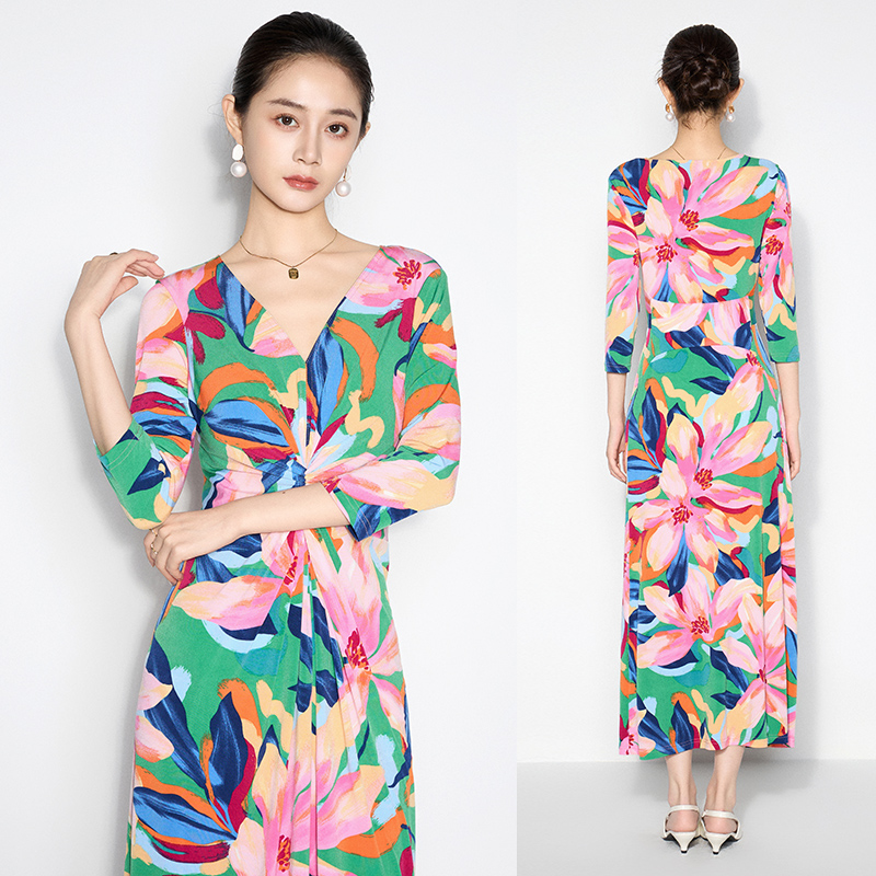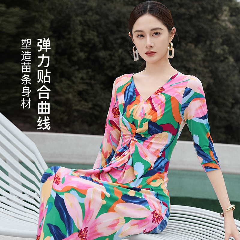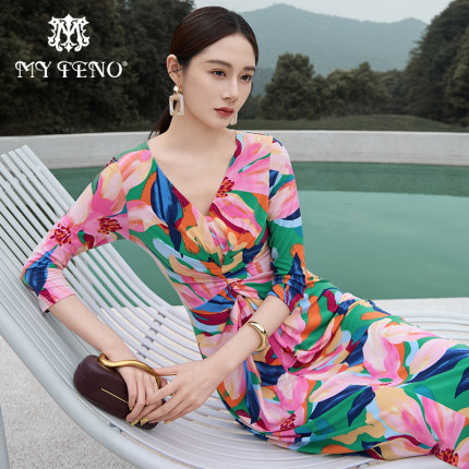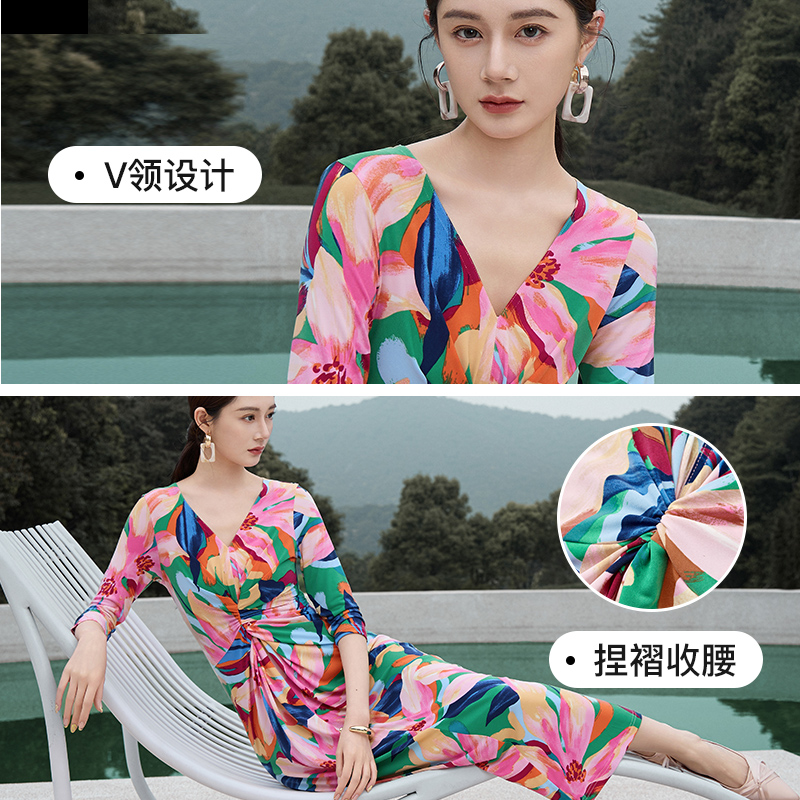 马天奴2025夏季新款粉色印花连衣裙子V领修身收腰撞色气质时尚女