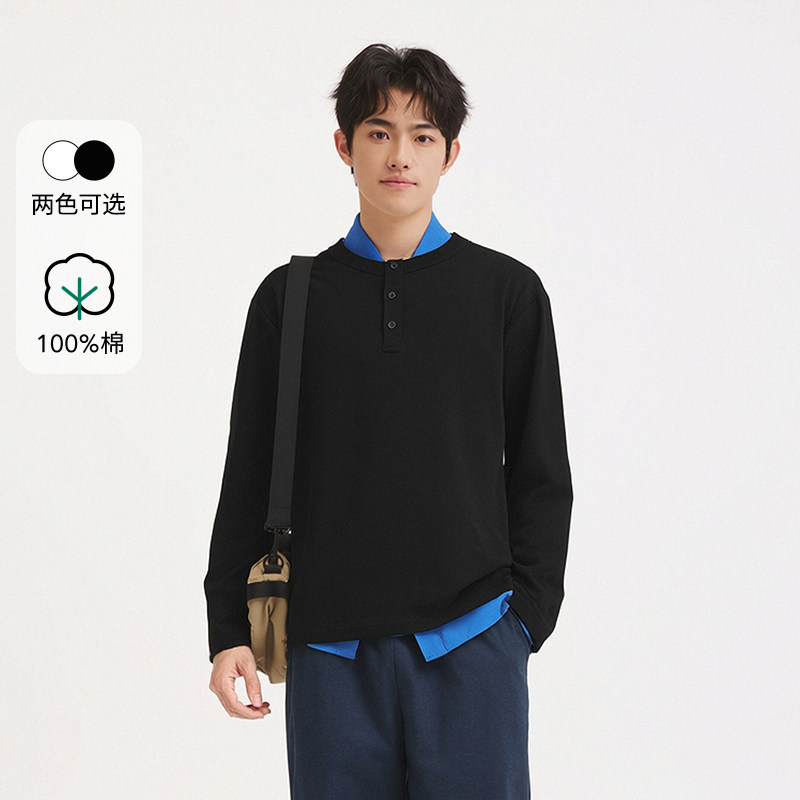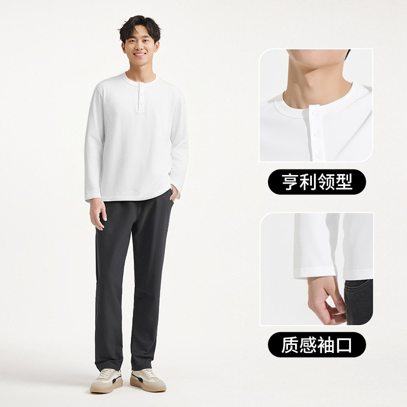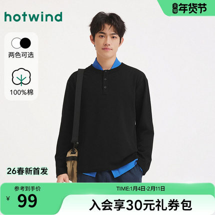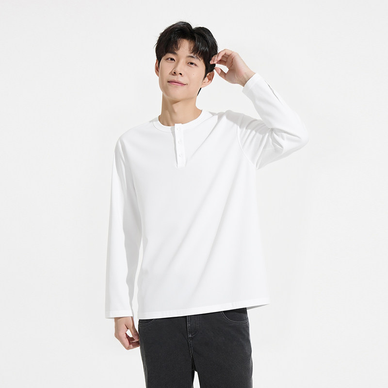 热风2026年春季新款男士亨利领长T休闲风长袖纯色日常套头T恤上衣