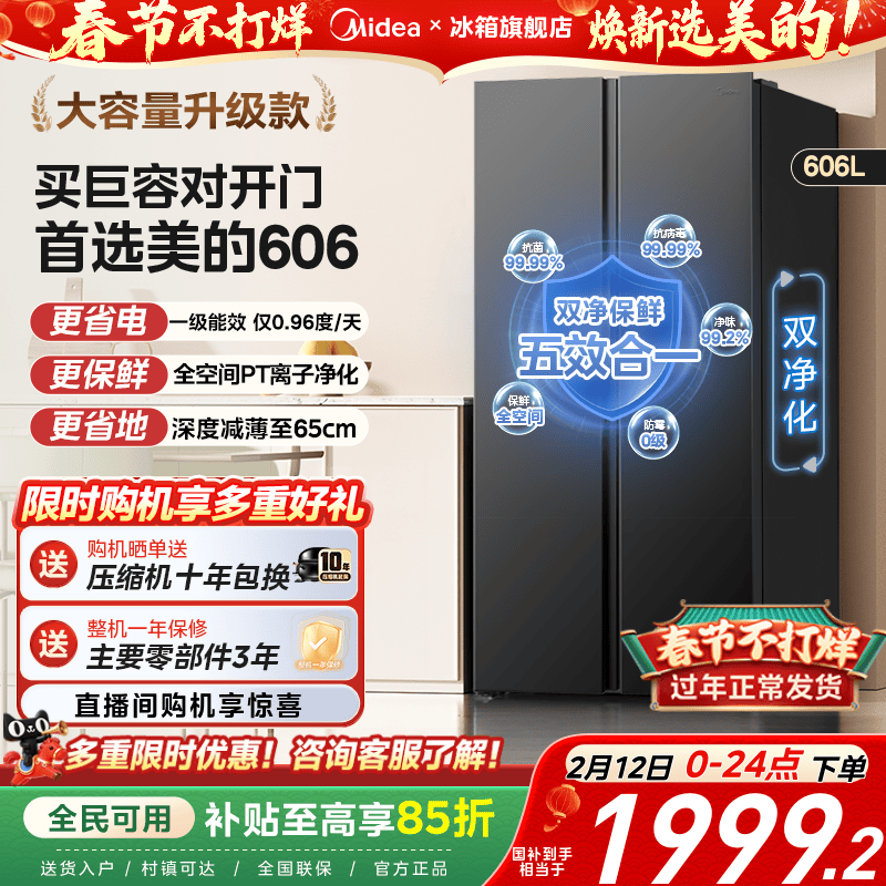 美的606对开双开门大容量超薄风冷无霜一级能效节能家用冰箱