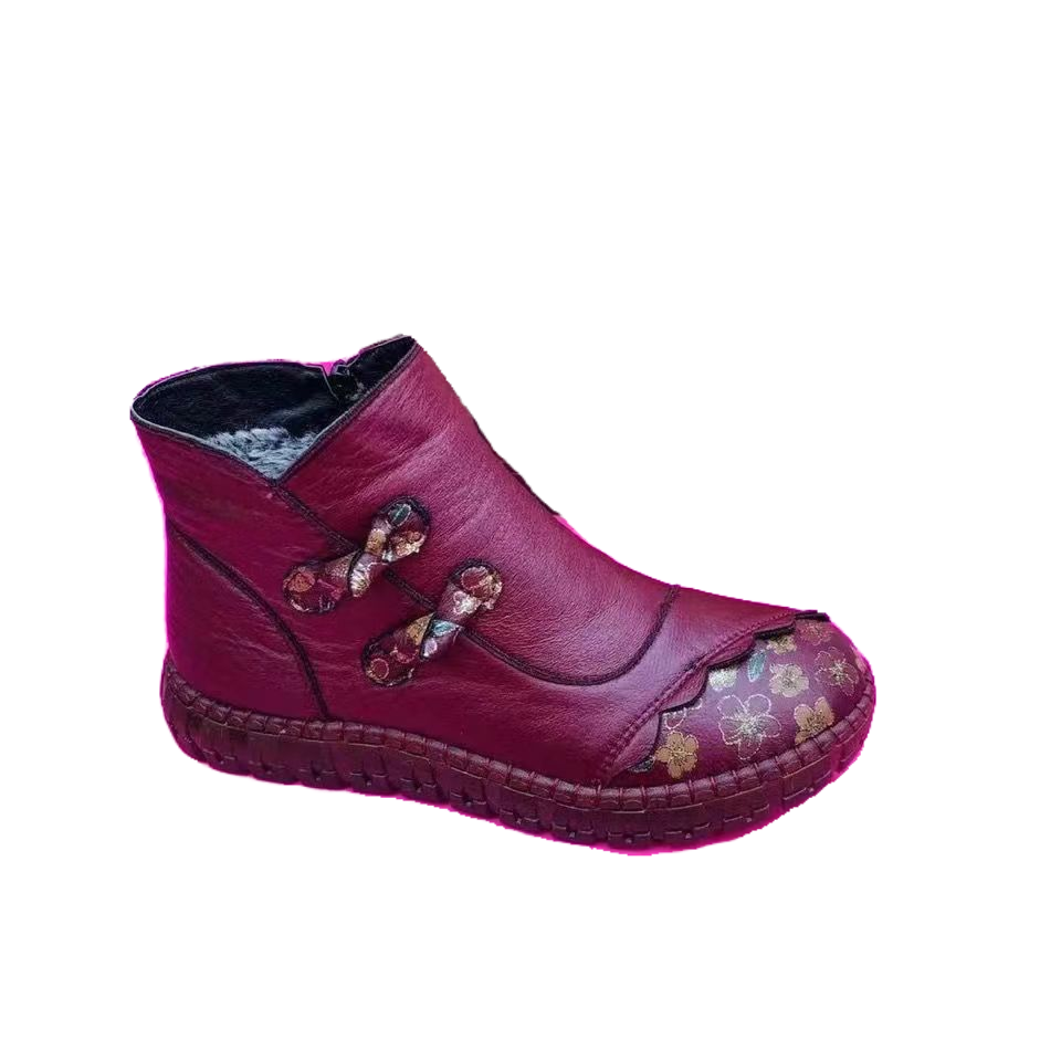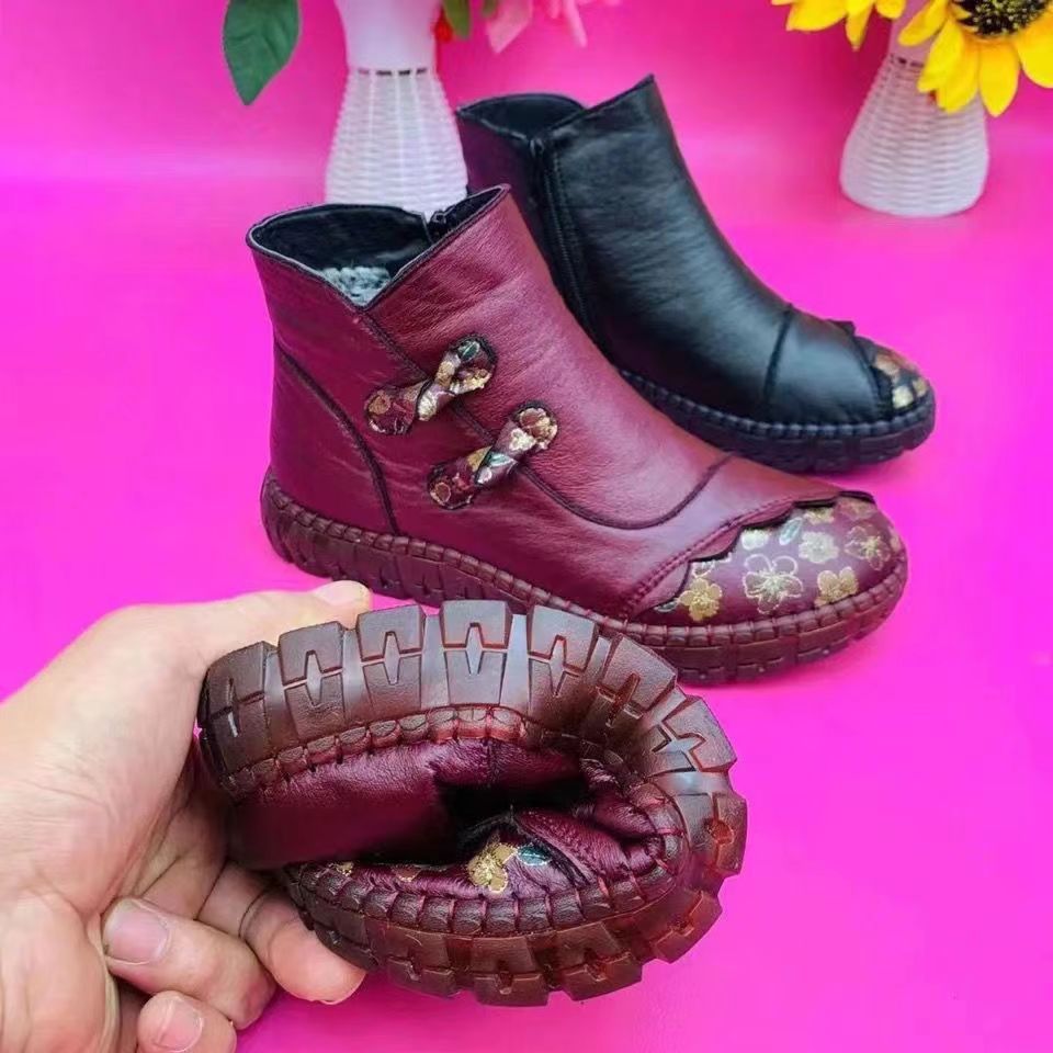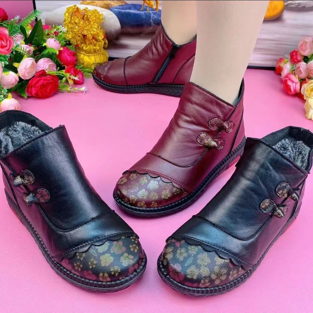 老北京布鞋妈妈棉鞋加绒保暖平底防滑皮鞋女冬中老年靴子平跟短靴