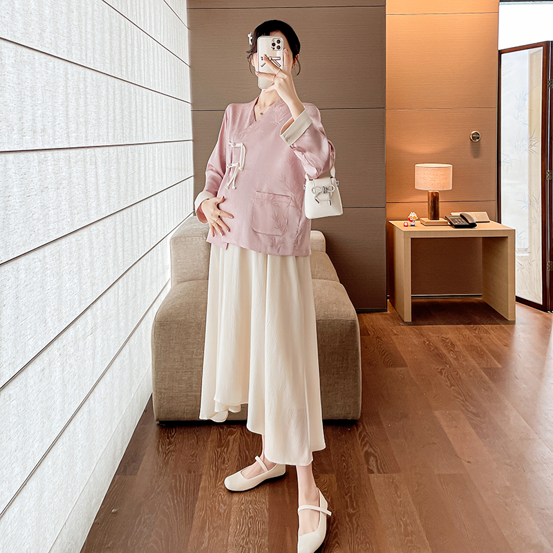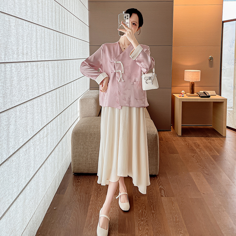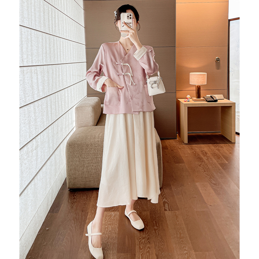 孕妇连衣裙套装时尚国风新中式旗袍上衣半身裙两件套2025新款春秋