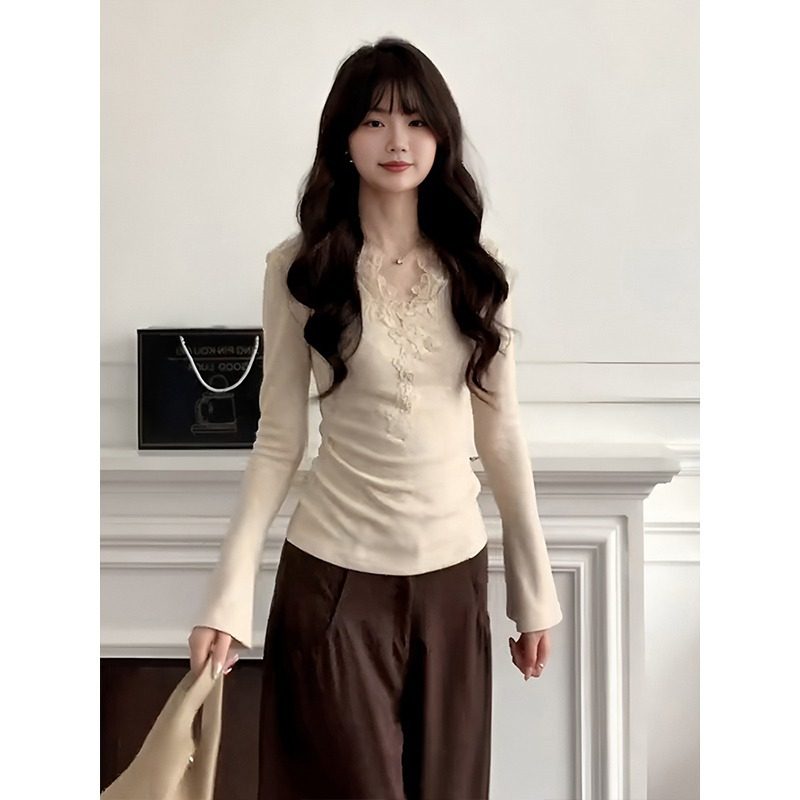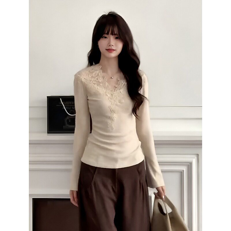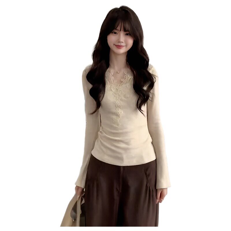 大码法式蕾丝V领长袖T恤女秋冬季胖mm加绒磨毛气质内搭打底衫上衣