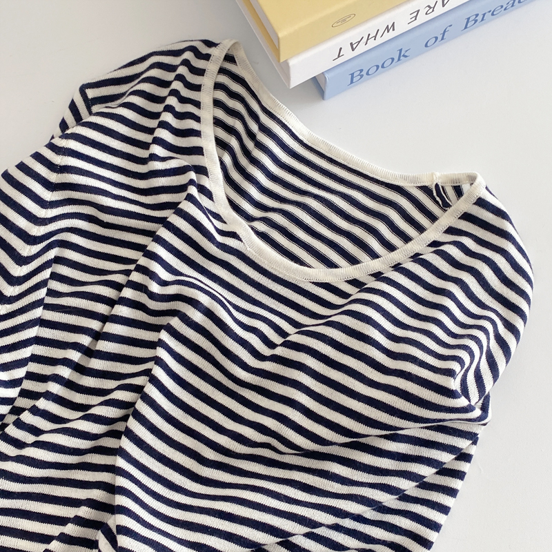 2025年早秋季新款圆领薄款条纹长袖针织衫T恤衫防晒衣女打底毛衣