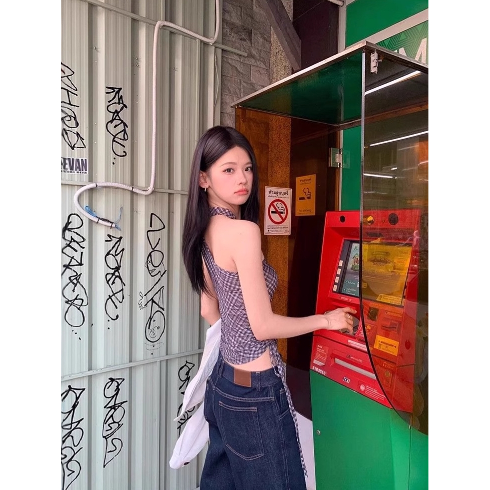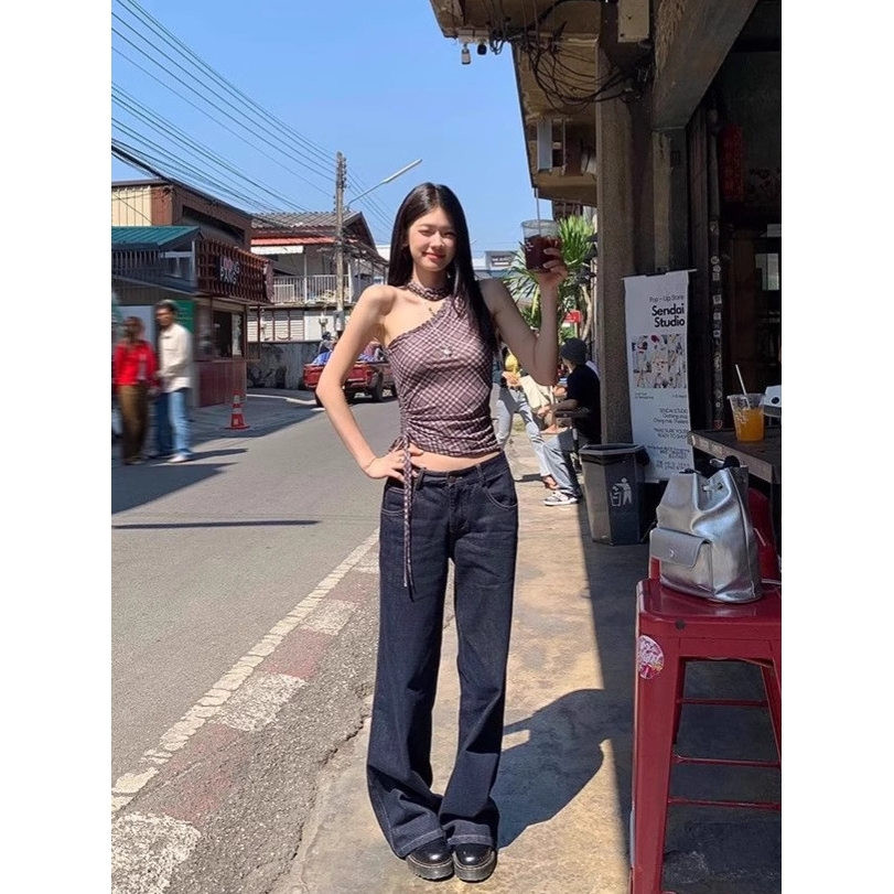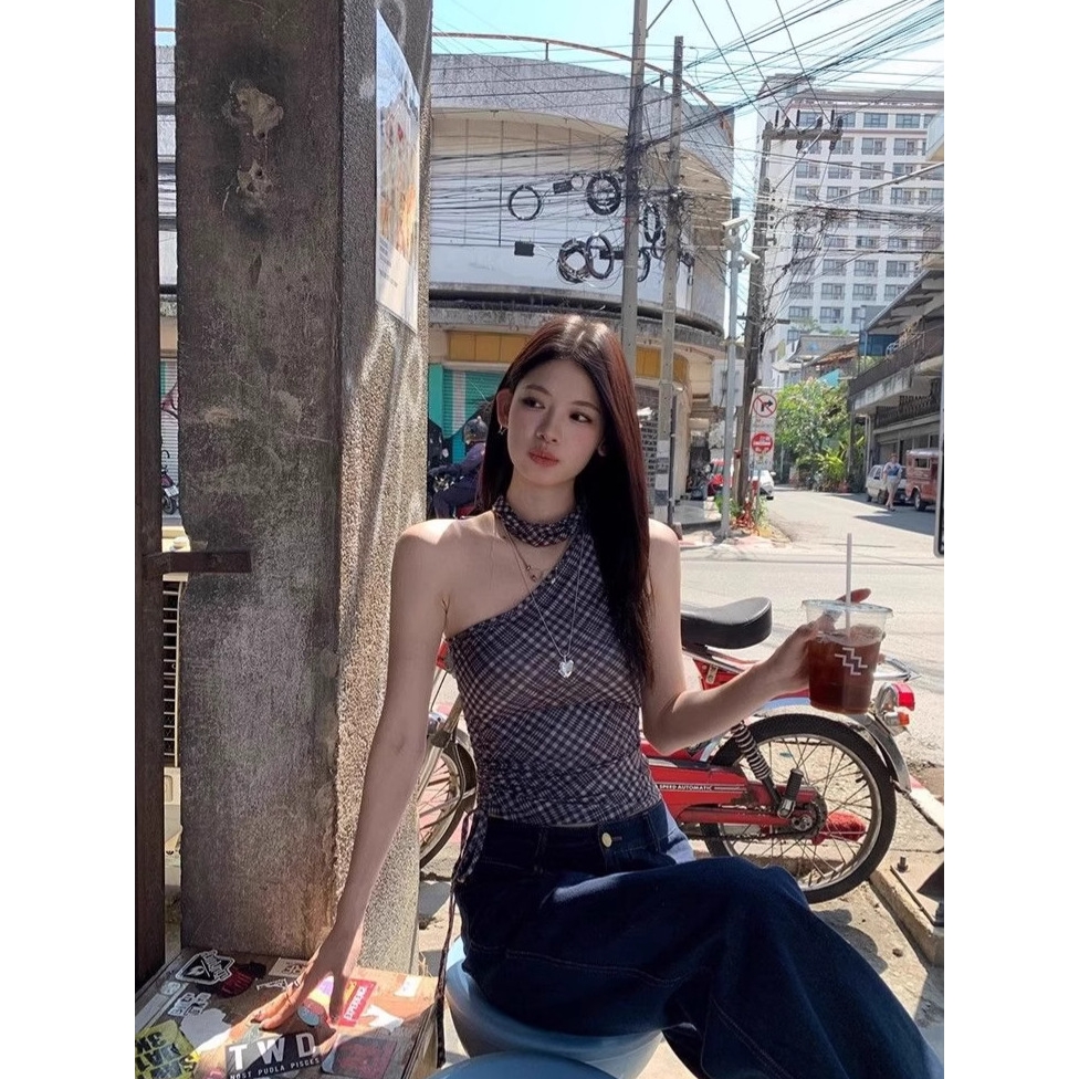 不规则黑色格子斜肩吊带背心女夏季性感辣妹气质短款修身露肩上衣