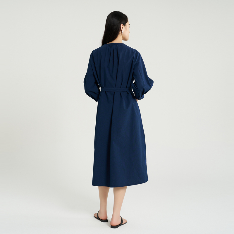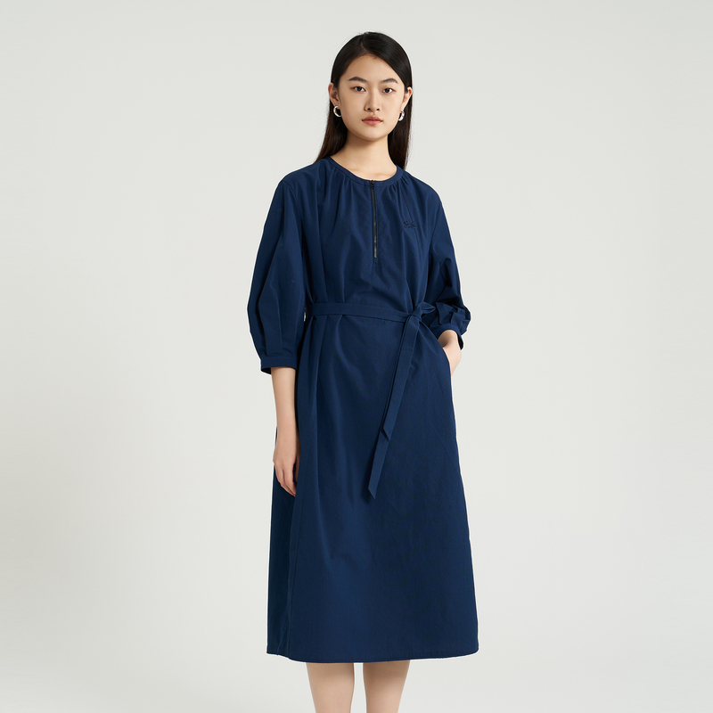 OTT【商场同款】春秋新款小A抽褶圆领衬衫连衣裙女中式腰带长裙