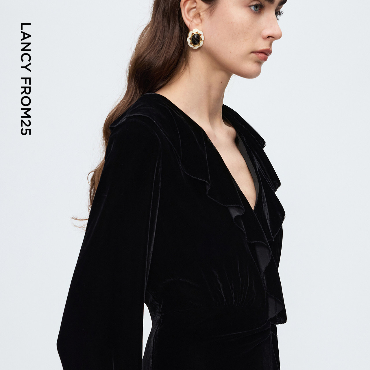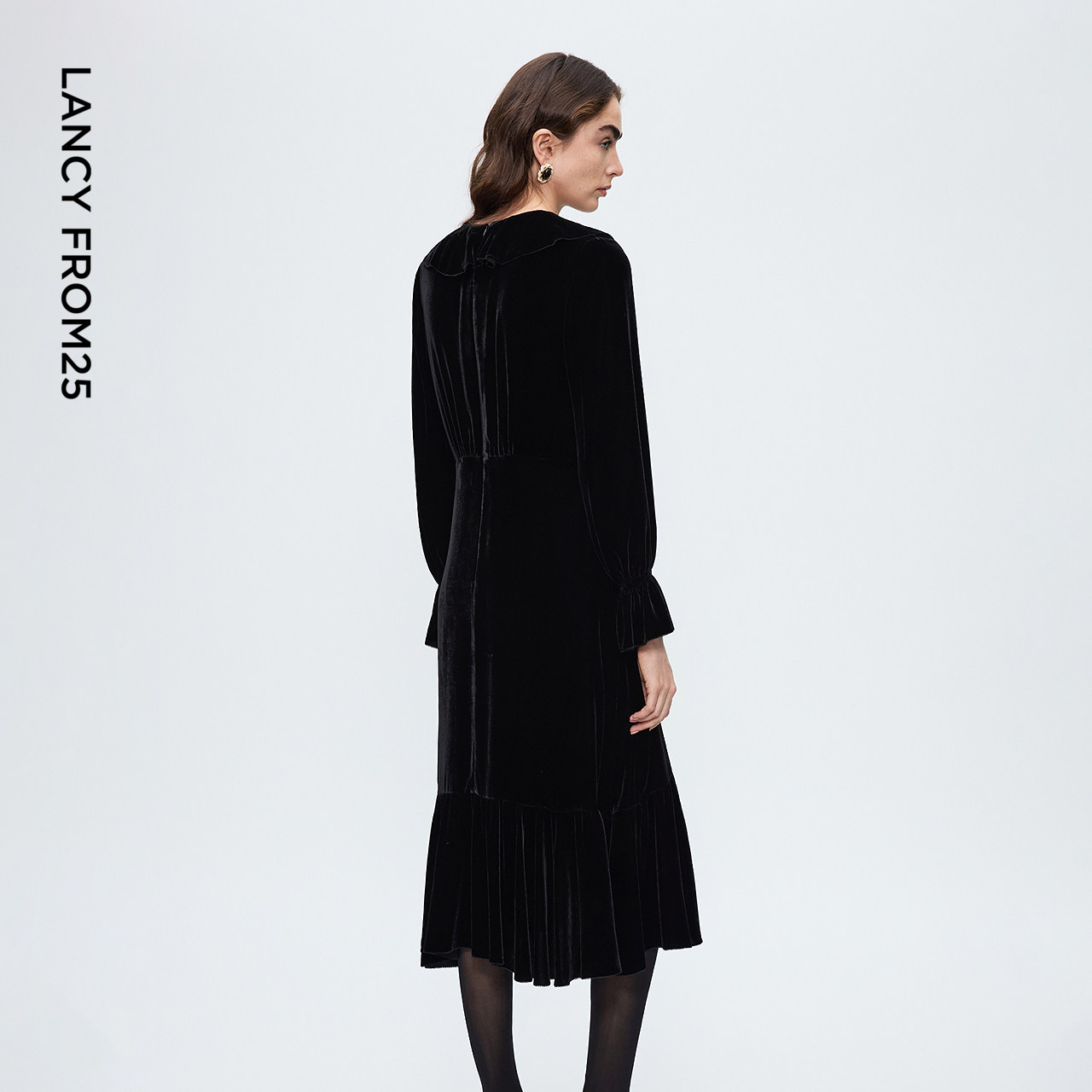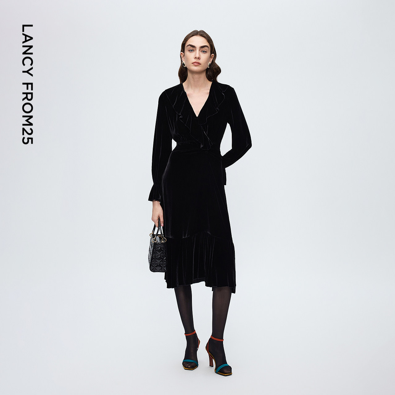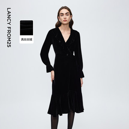 朗姿真丝丝绒v领收腰连衣裙气质高级感轻礼服裙2025年冬季新款女