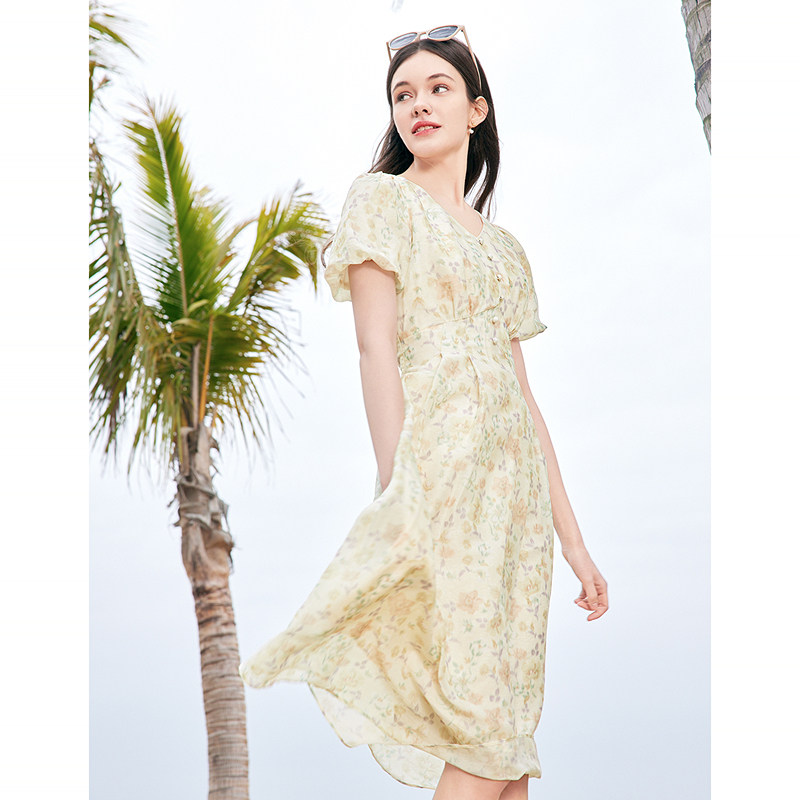 betu百图女装2025年夏季新款高腰印花连衣裙女V领碎花裙中长裙