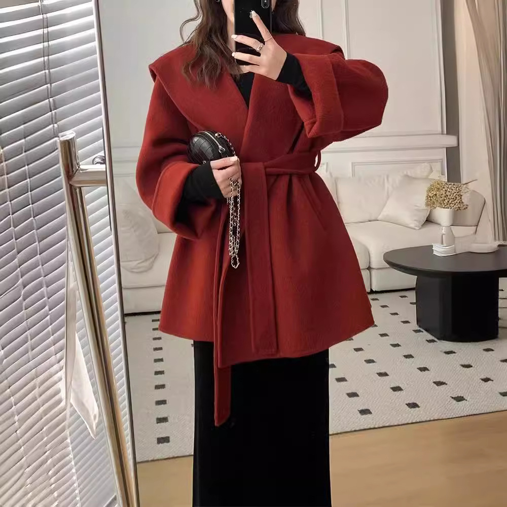 2025秋冬新款双面羊绒红色大衣短款修身羊毛呢小个子女大翻领外套