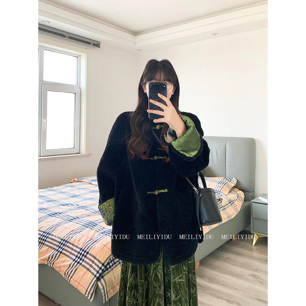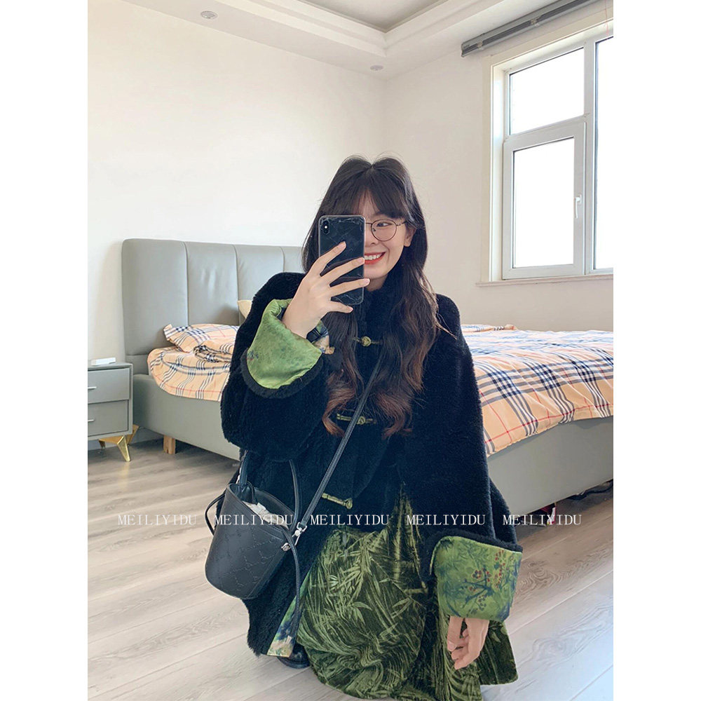 秋冬新中式国风撞色外套绿色半身裙套装女大码胖mm宽松显瘦两件套