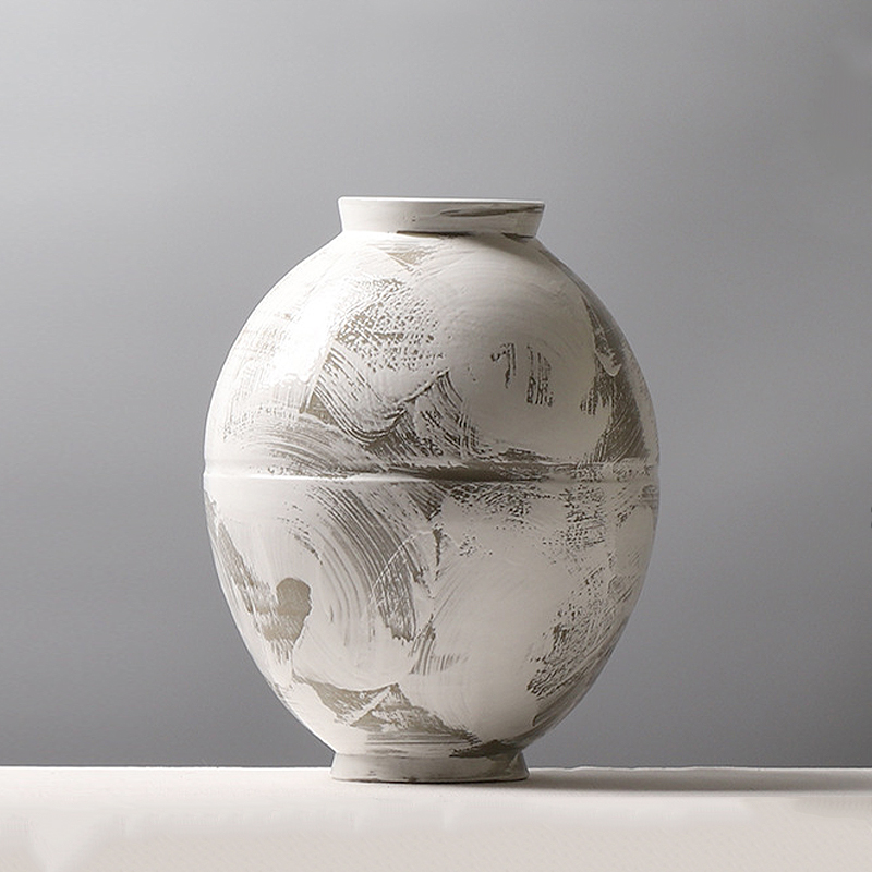 现代简约中式禅意手绘艺术扫画纹白色釉陶大号陶罐花瓶装饰品摆件