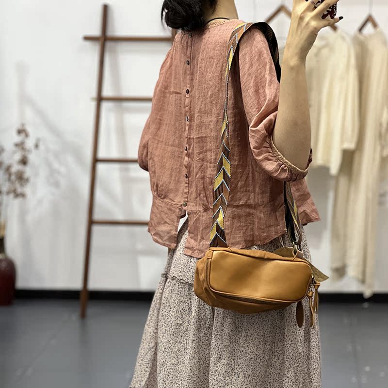 古与色夏季文艺复古拼接方领后开扣宽松衬衣五分袖苎麻衬衫女上衣