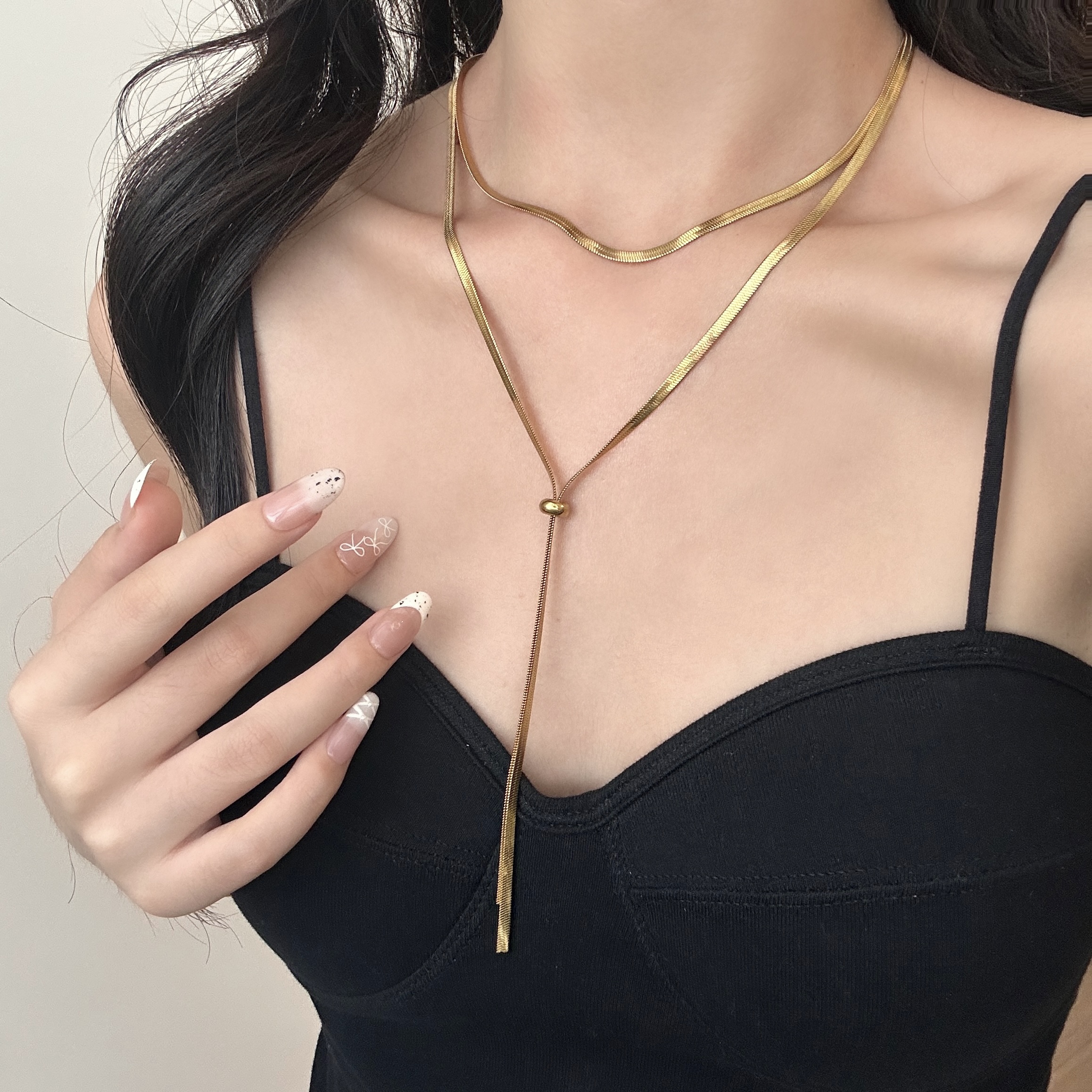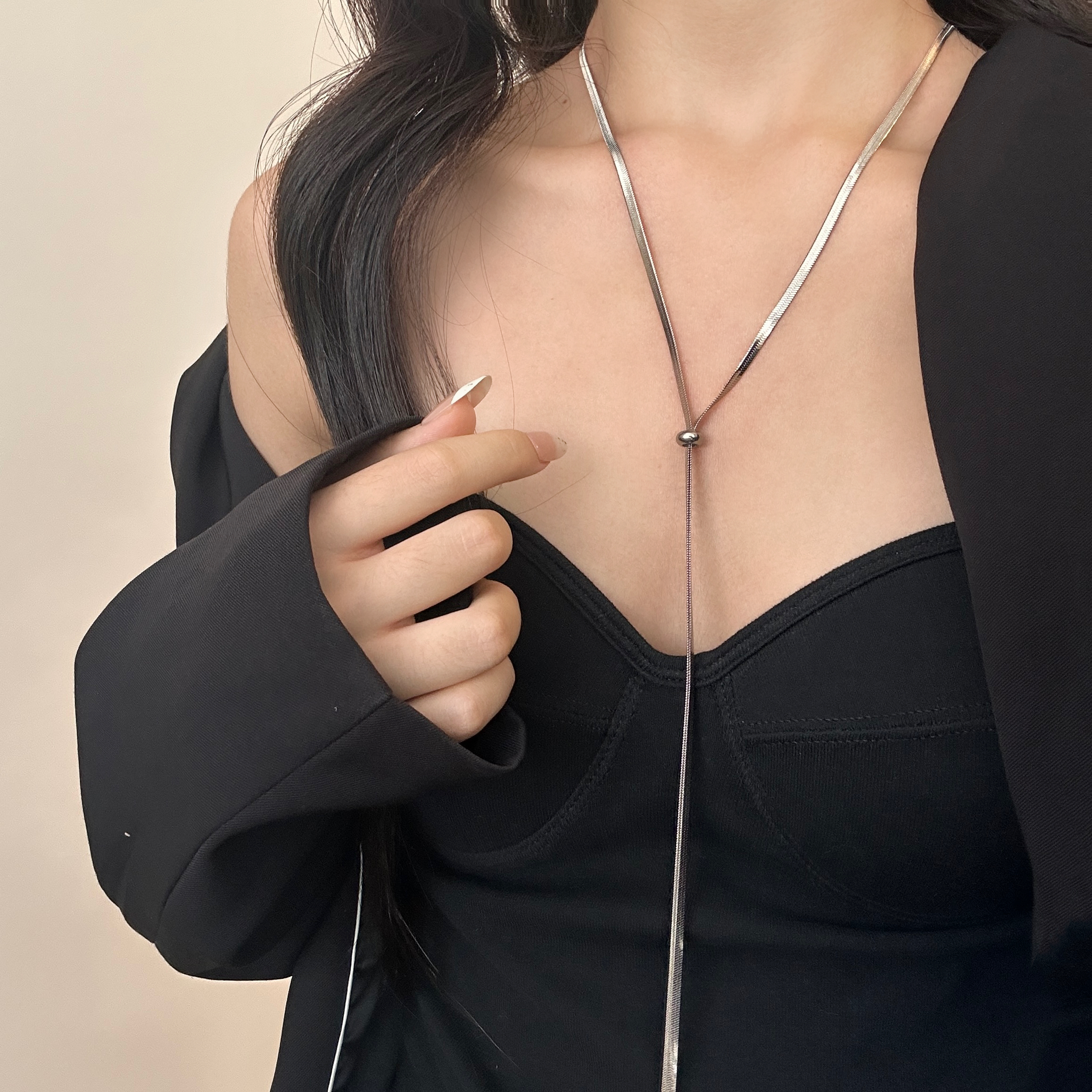 冷淡风金属抽拉蛇链扁平链小众高级感长款叠带毛衣链女钛钢不掉色