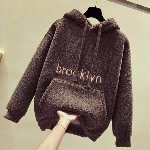 秋冬新款羊羔绒卫衣韩版学生宽松连帽上衣加绒加厚保暖外套女