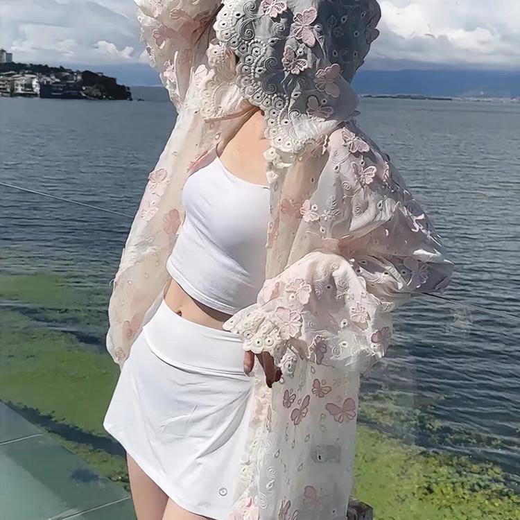 重工蝴蝶刺绣长袖连帽防晒衬衫女