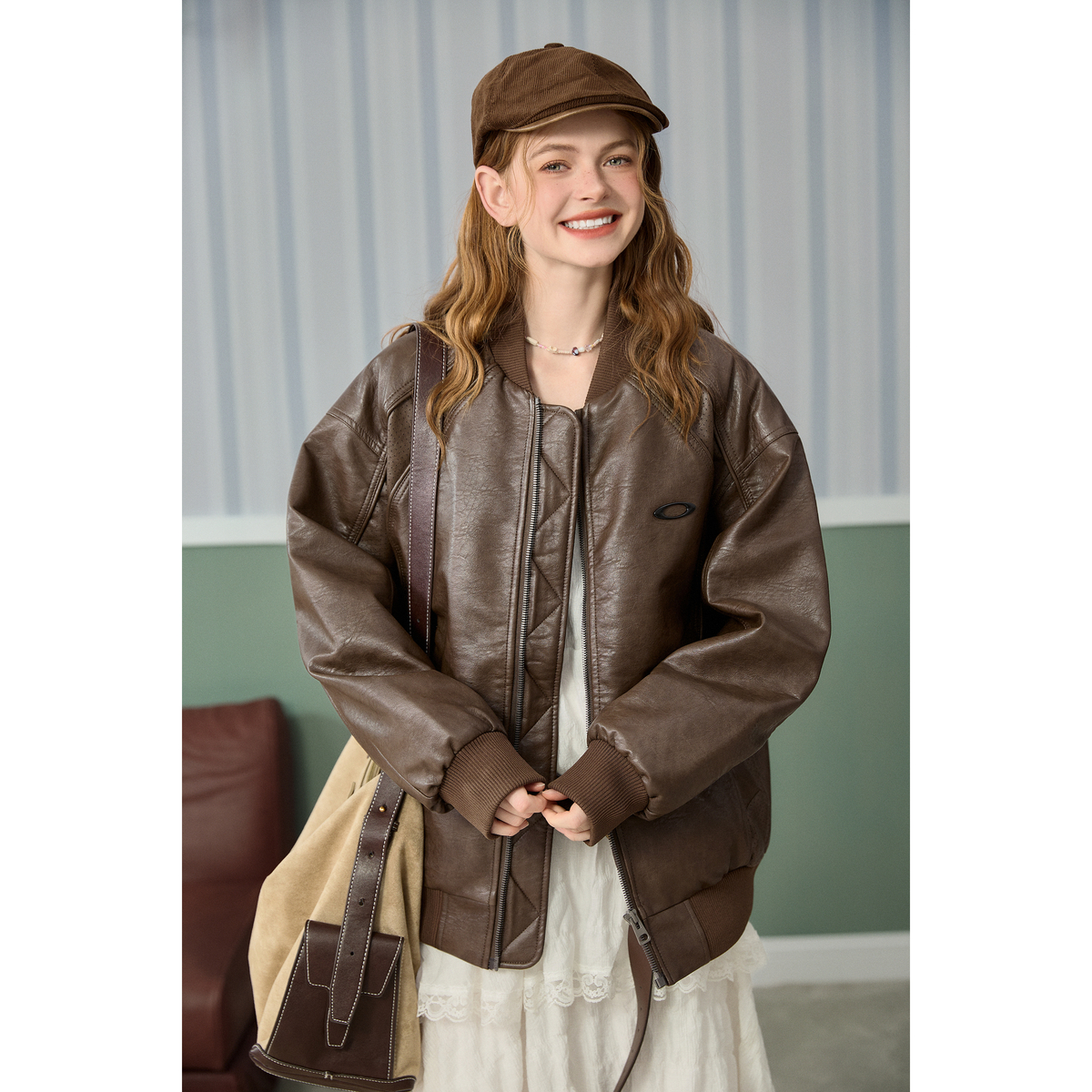 唐狮2025秋冬季女款短款外套仿皮衣羽绒服棕色开衫外套棒球领保暖