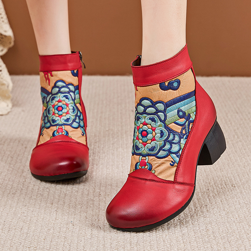 新国风高跟小短靴女真皮春秋古典印花单靴复古中式汉服厚底及裸靴