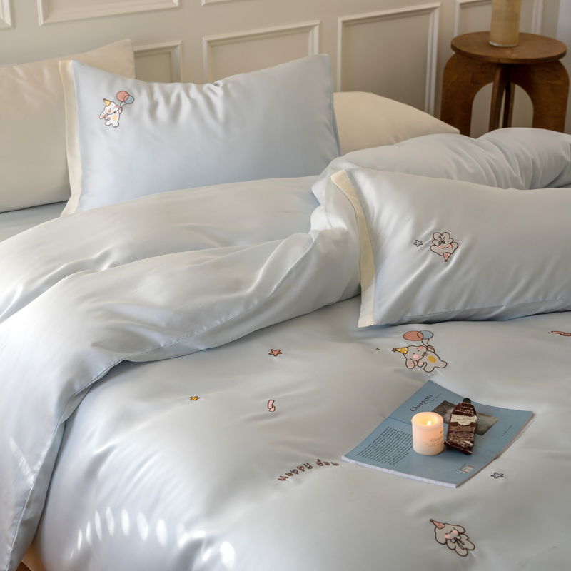晚安猫ins可爱刺绣裸睡天丝四件套卡通被套三件套床单床笠床品