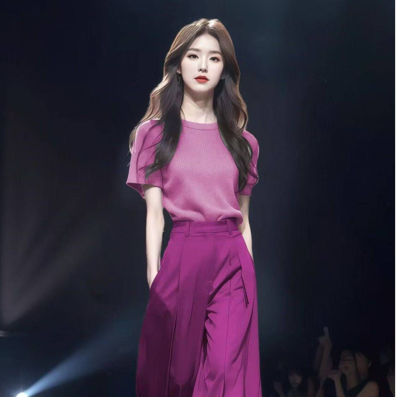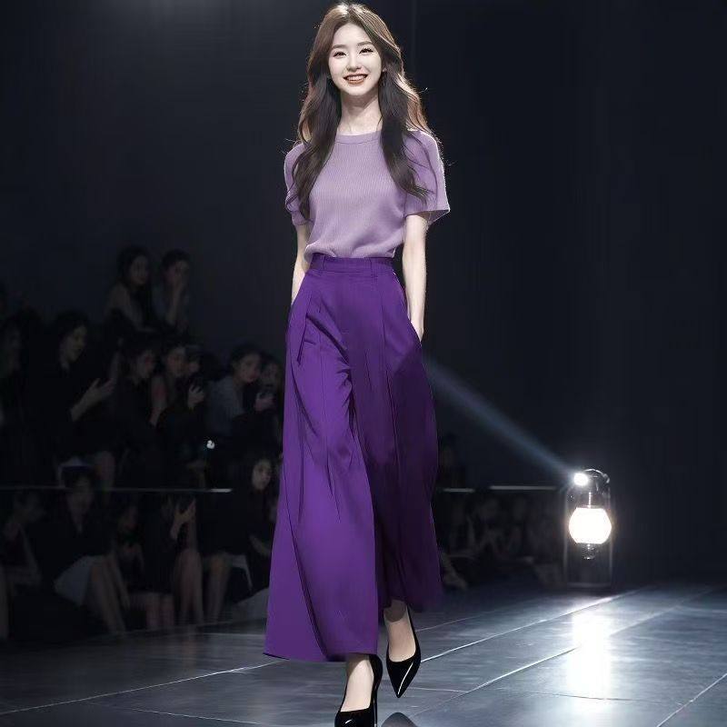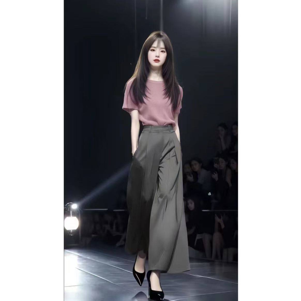 时尚短袖T恤女宽松显瘦2025夏季新款韩版纯色体恤阔腿裙裤两件套