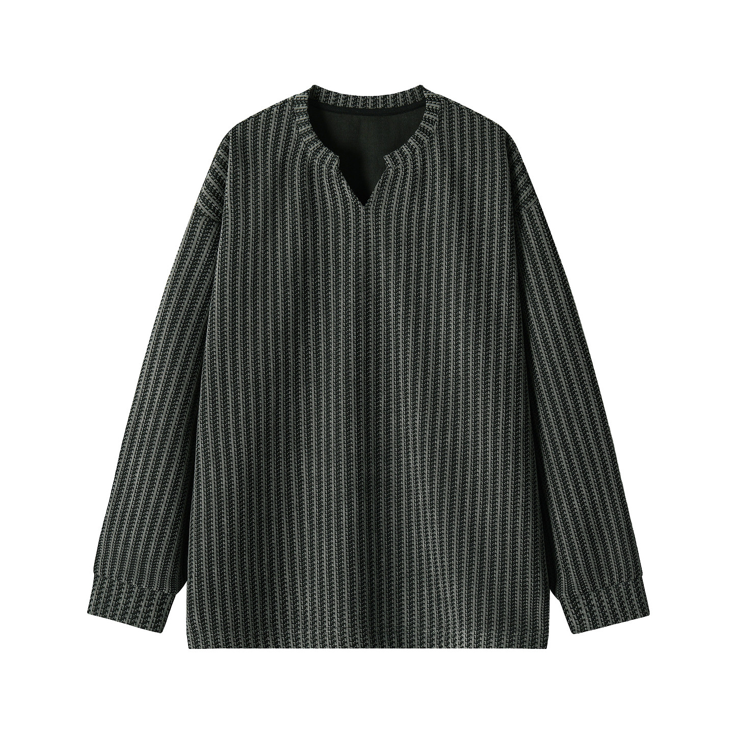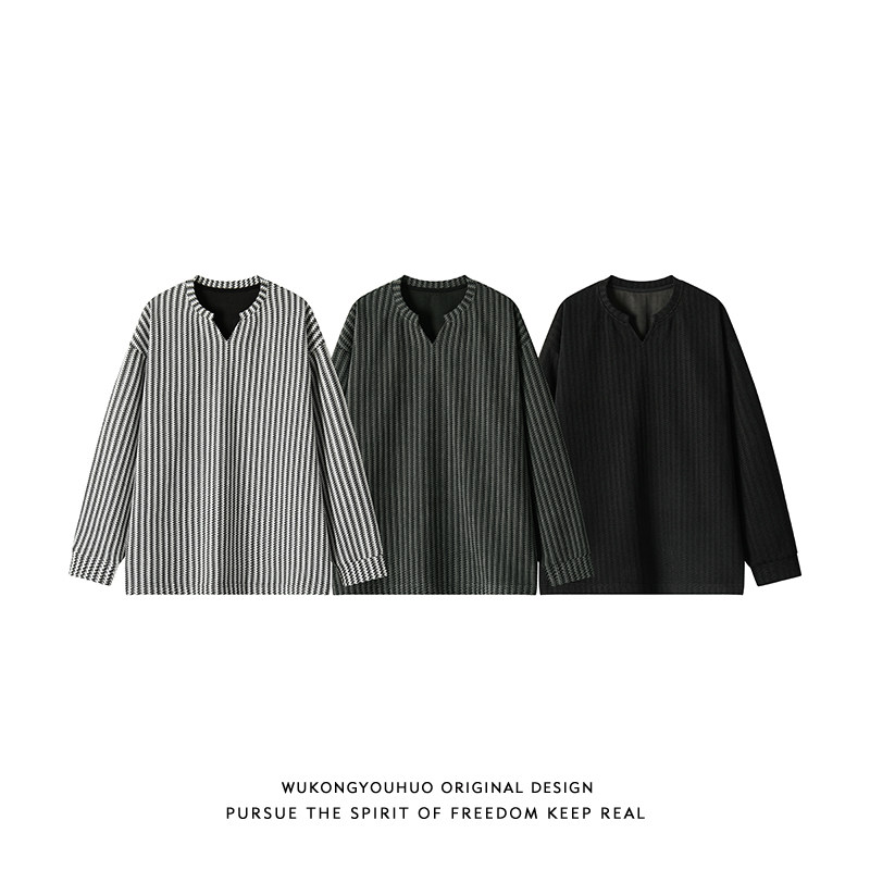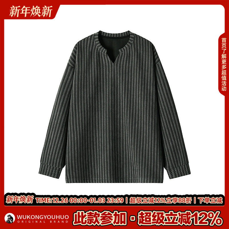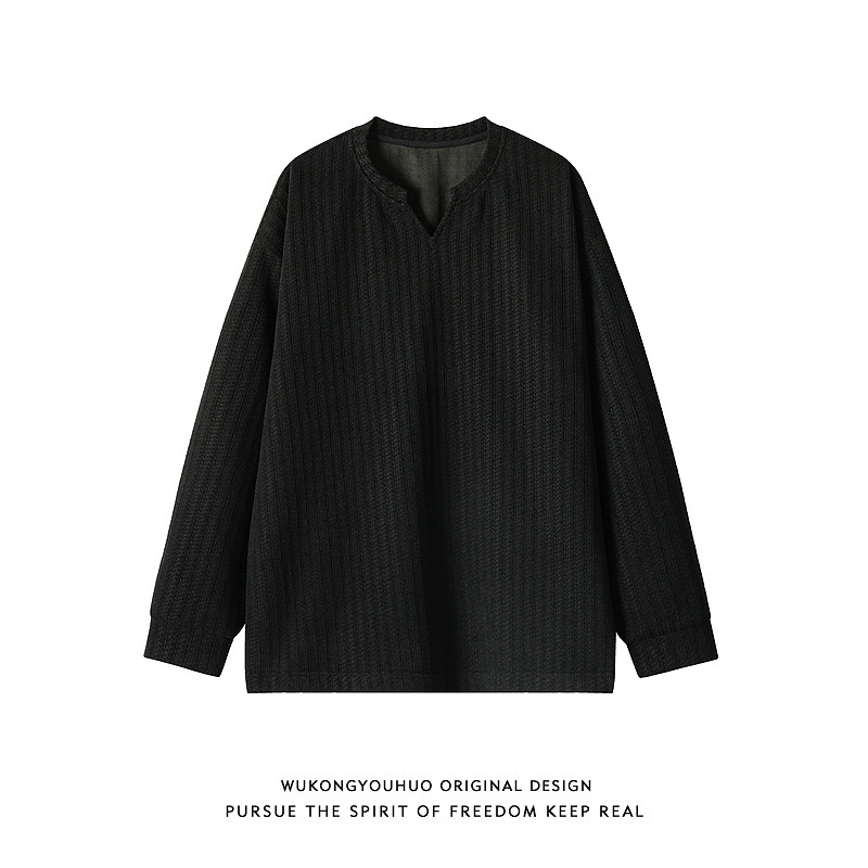 悟空有货肌理感鱼骨纹小V领长袖t恤男秋季慵懒风宽松内搭打底上衣