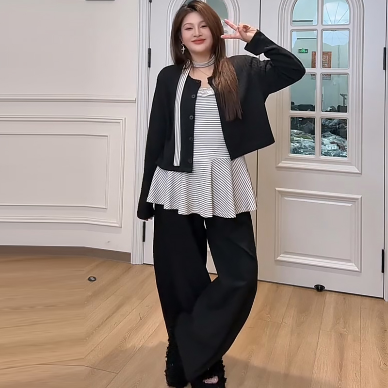 氛围感条纹吊带开衫外搭弯刀裤胖mm2025秋季新款显瘦宽松大码女装