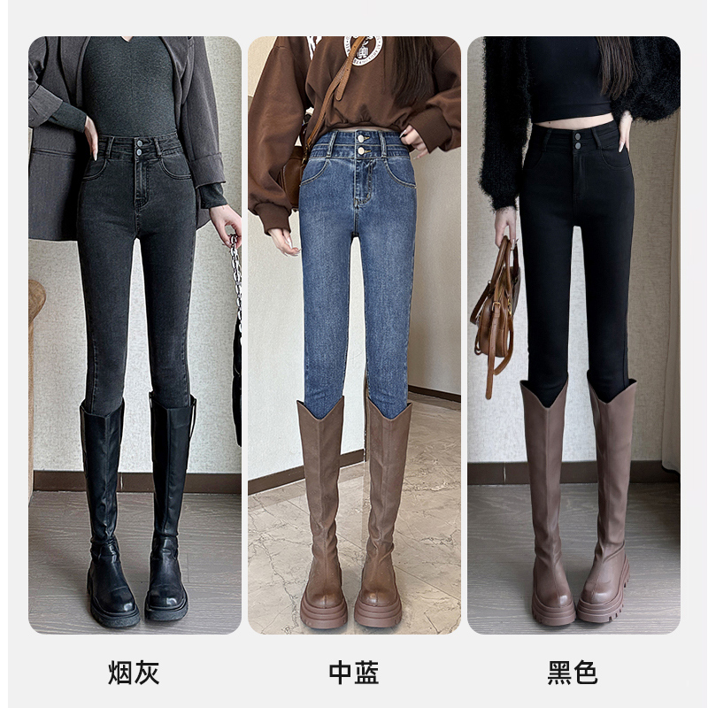 加绒复古蓝牛仔裤女2025年春秋冬新款修身紧身弹力高腰铅笔小脚裤