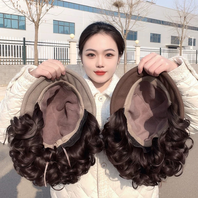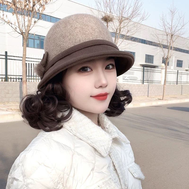 帽子假发一体秋冬新款加厚羊毛呢渔夫帽慵懒卷洋气减龄短卷发头套