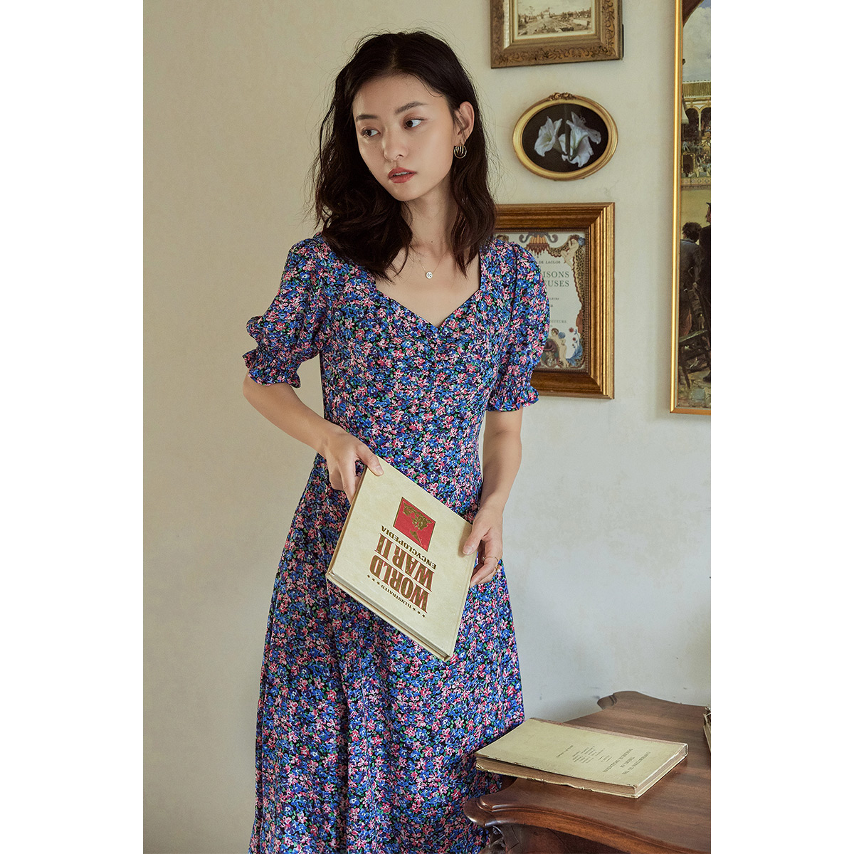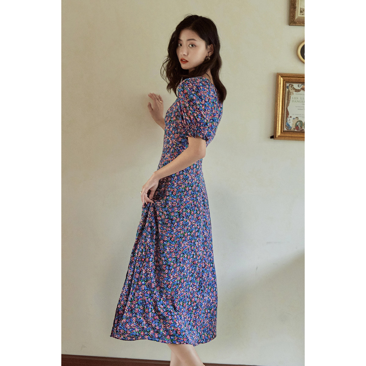 弥古通勤紫色法式碎花连衣裙夏