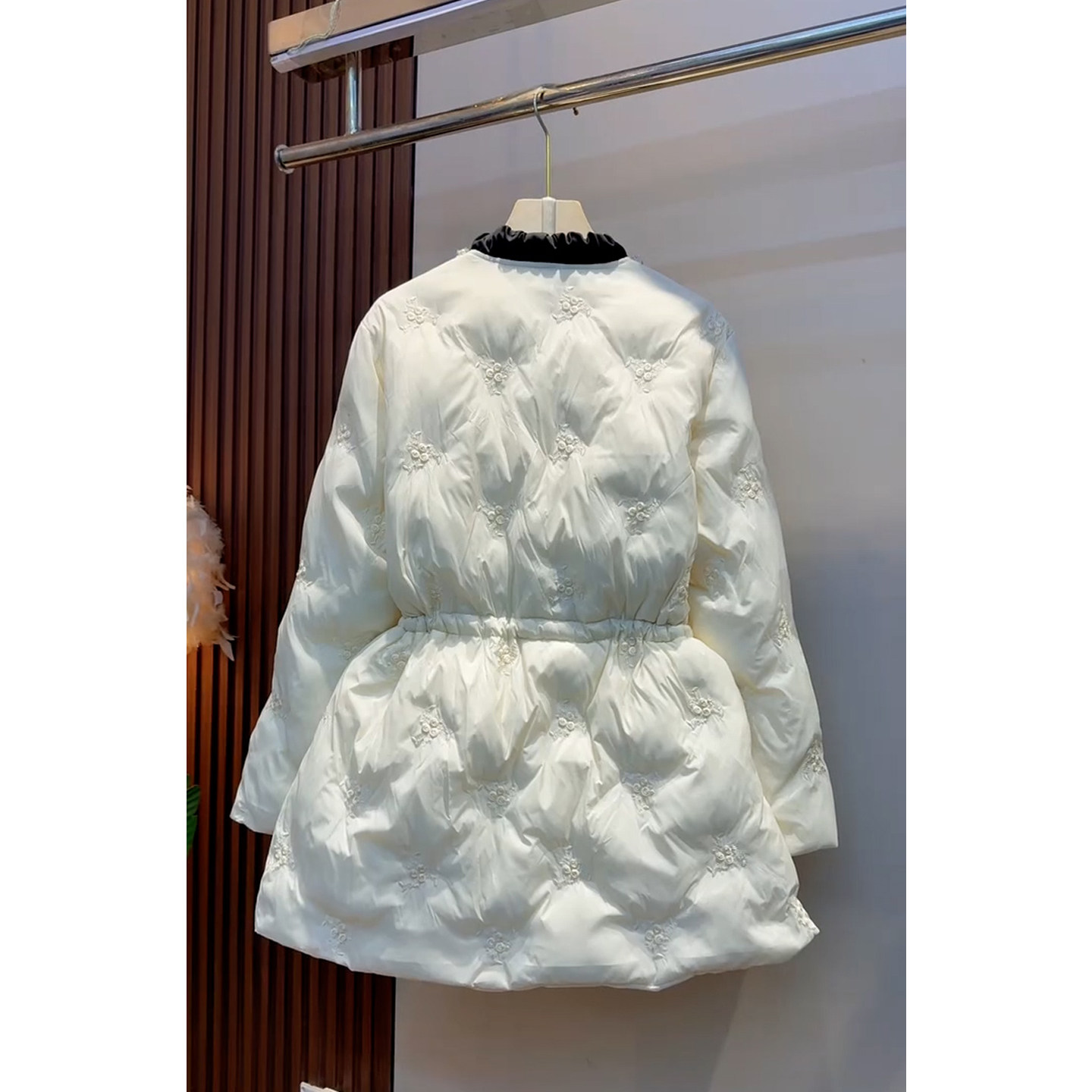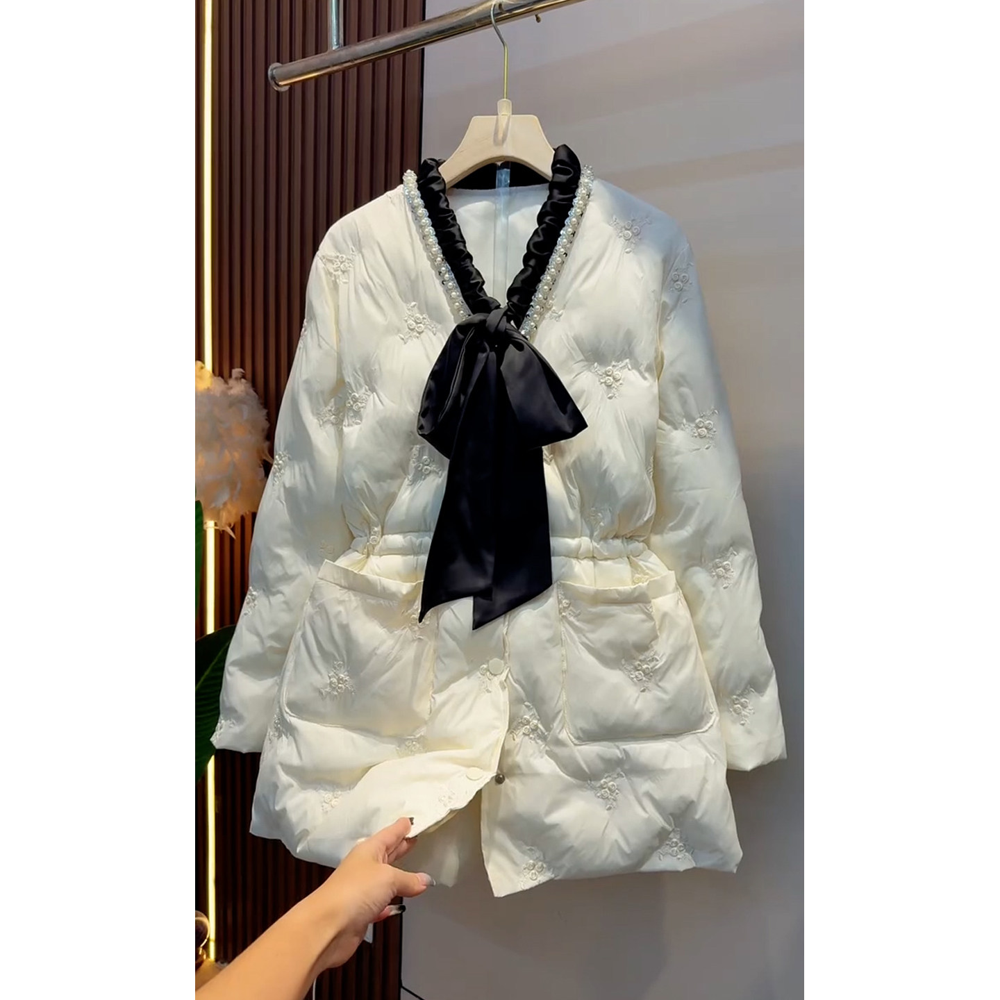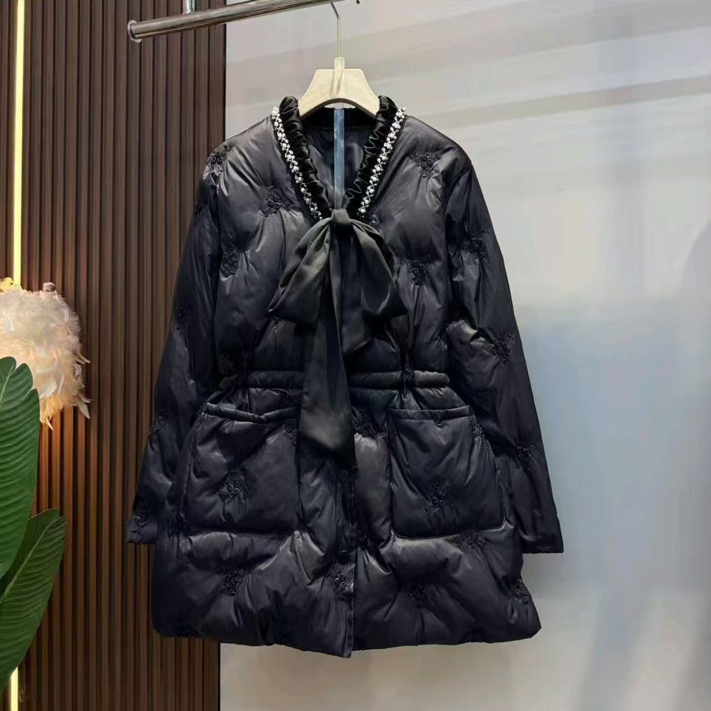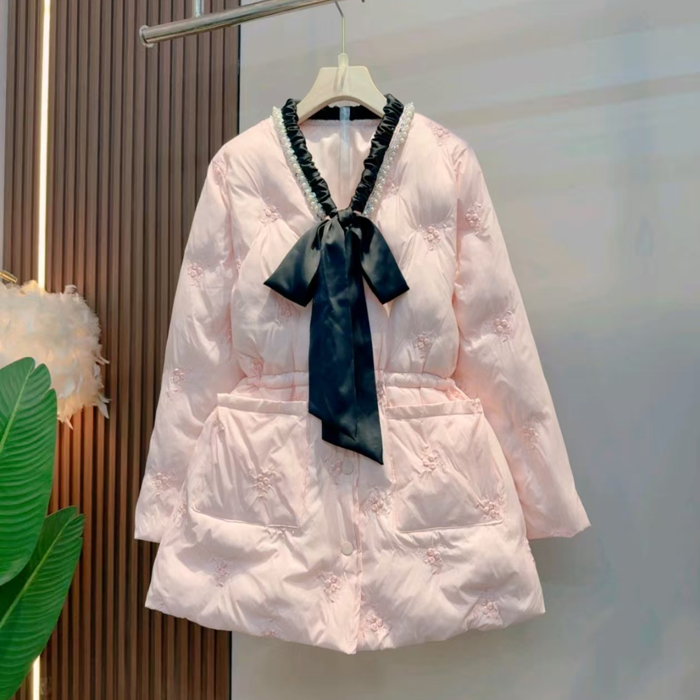 胖妹妹时尚冬季小香风蝴蝶结中长款棉服外套百搭显瘦宽松遮肉棉衣