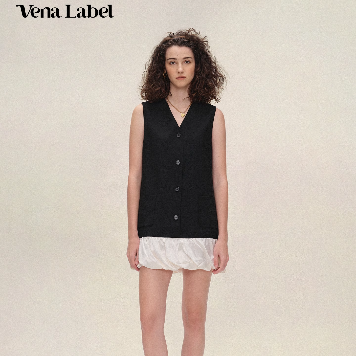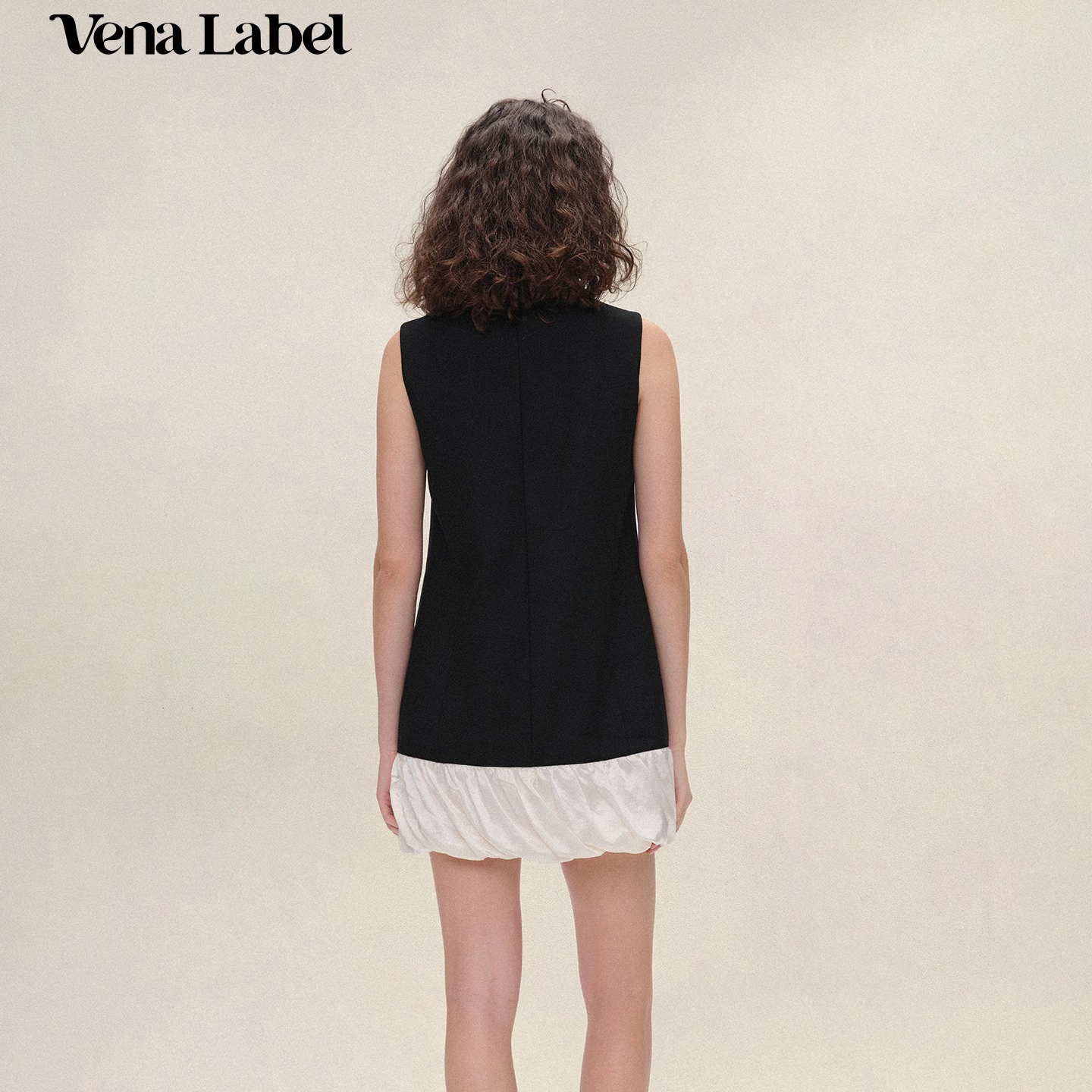 Vena Label 25FW新款法式拼接撞色花苞A字裙V领无袖连衣裙女
