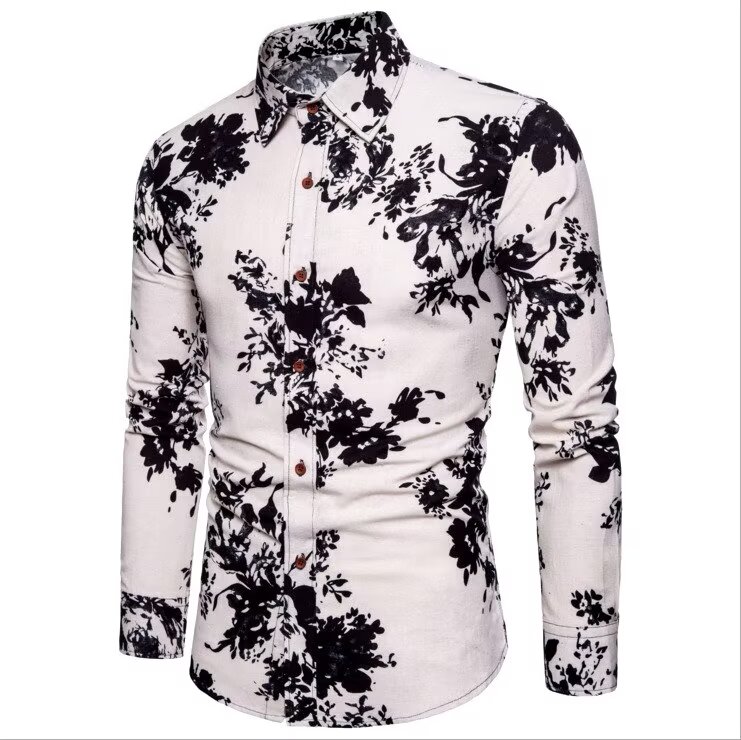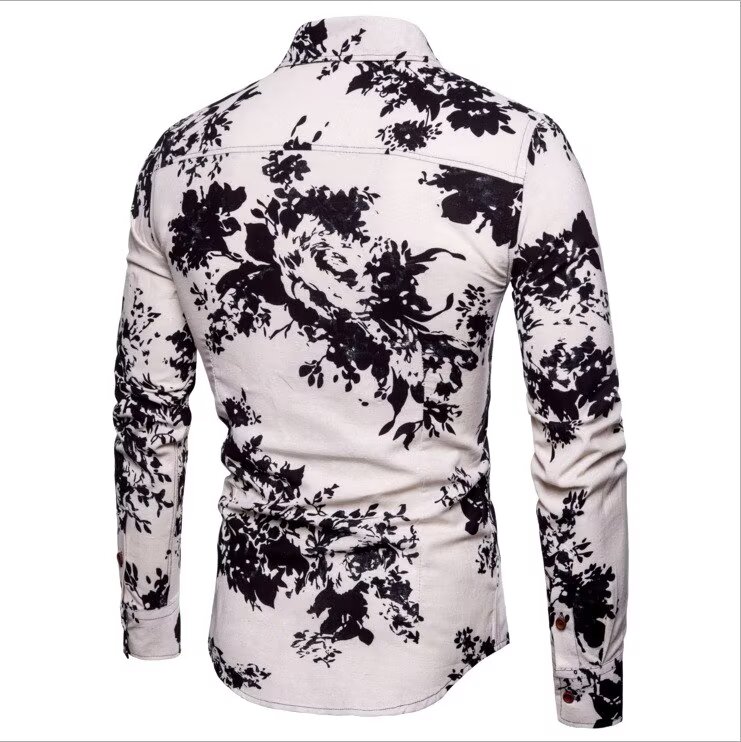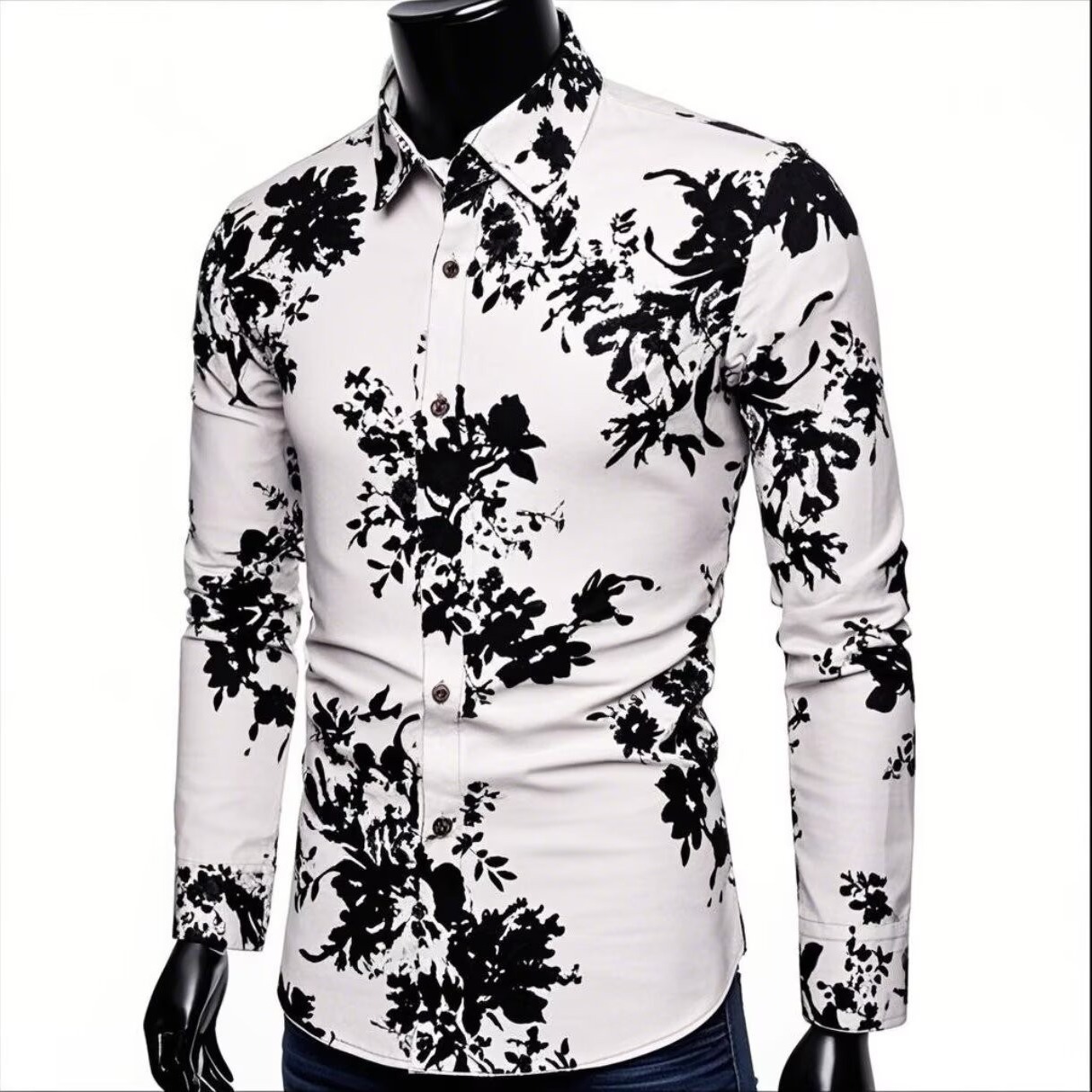 水墨扎染花衬衫男冰丝四面弹修身长袖开衫美式巴洛克花卉油画衬衣