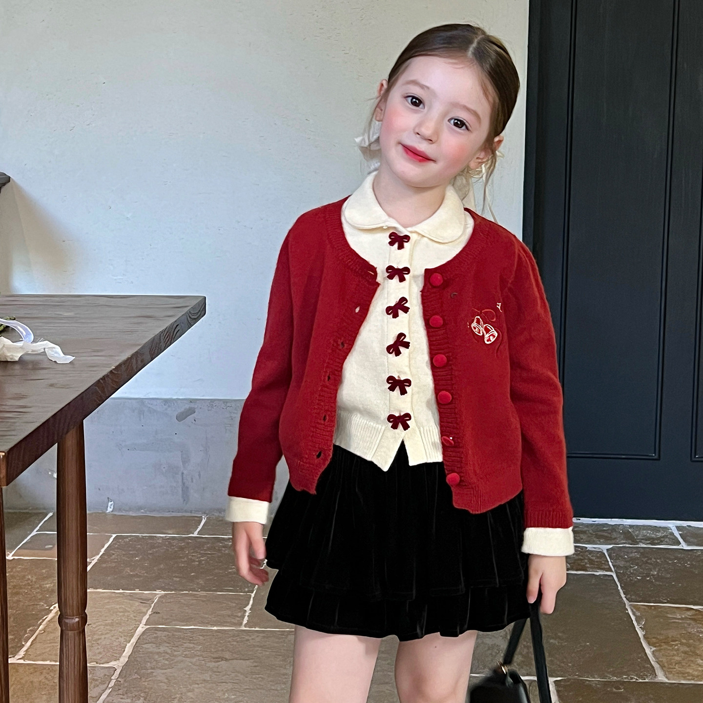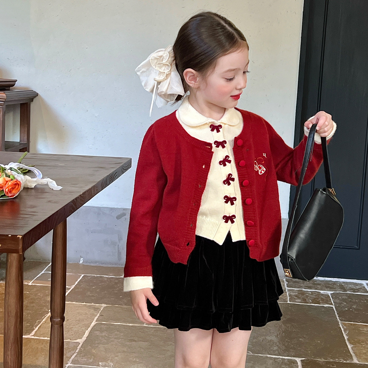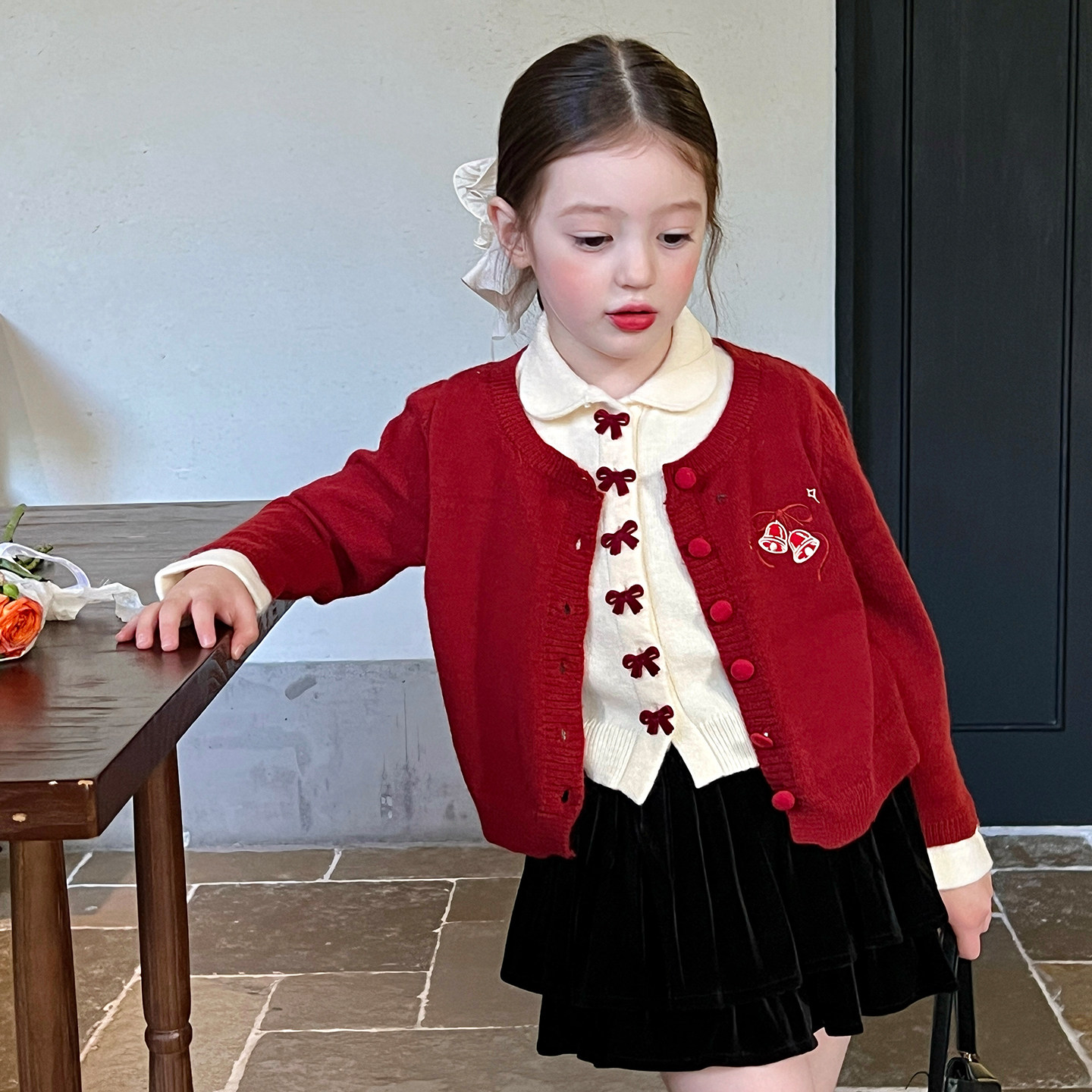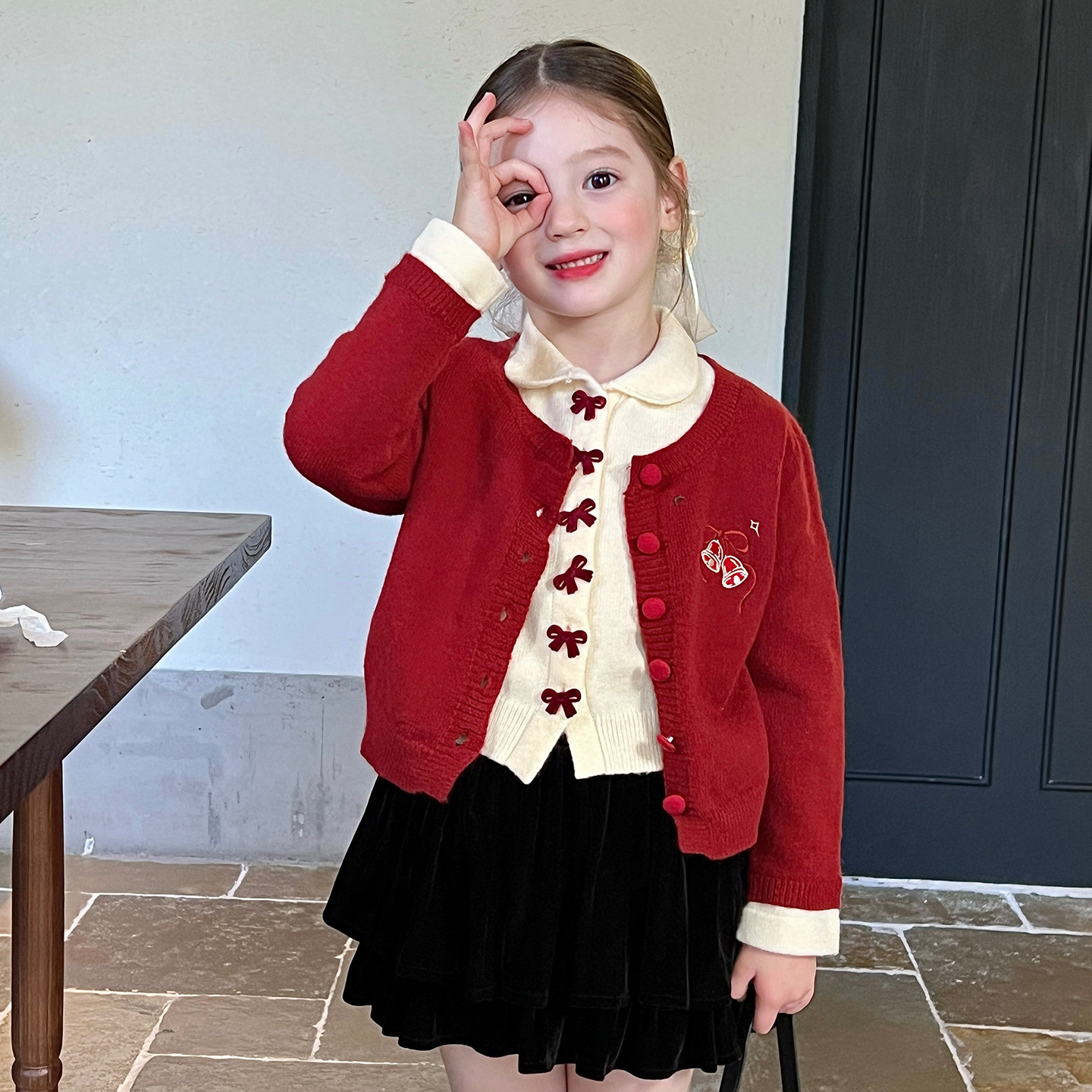 栀了成长记童装女童时髦假两件圣诞毛衣儿童女童红色百搭针织上衣
