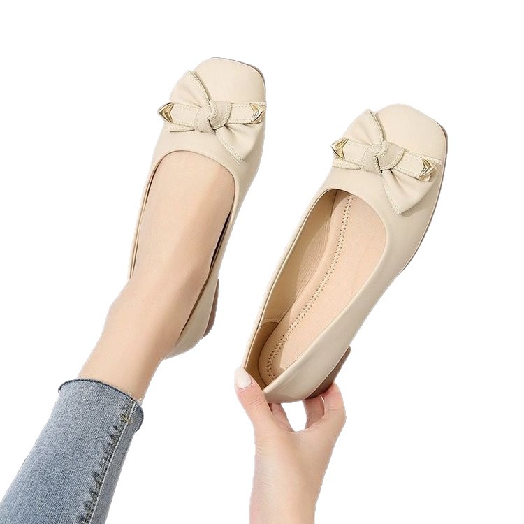 真皮粗跟软皮单鞋女2024年春季新软底款蝴蝶结浅口方头中跟豆豆