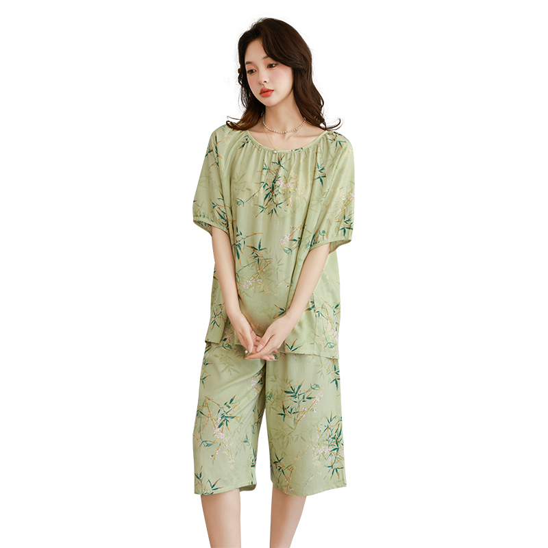 新款夏季棉绸睡衣女薄款中袖七分裤套装大码人造棉国风妈妈家居服