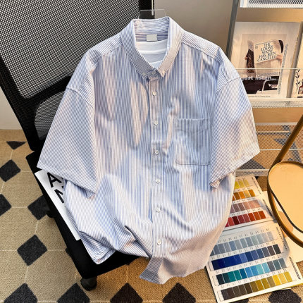 2025夏季新款条纹短袖口袋衬衫男装宽松休闲潮流ins衬衣翻领半袖