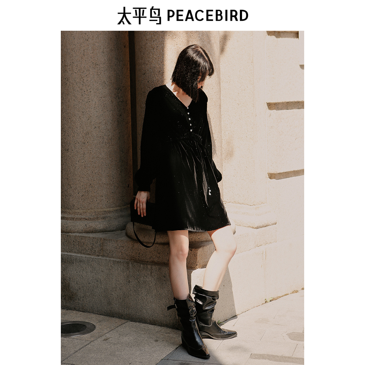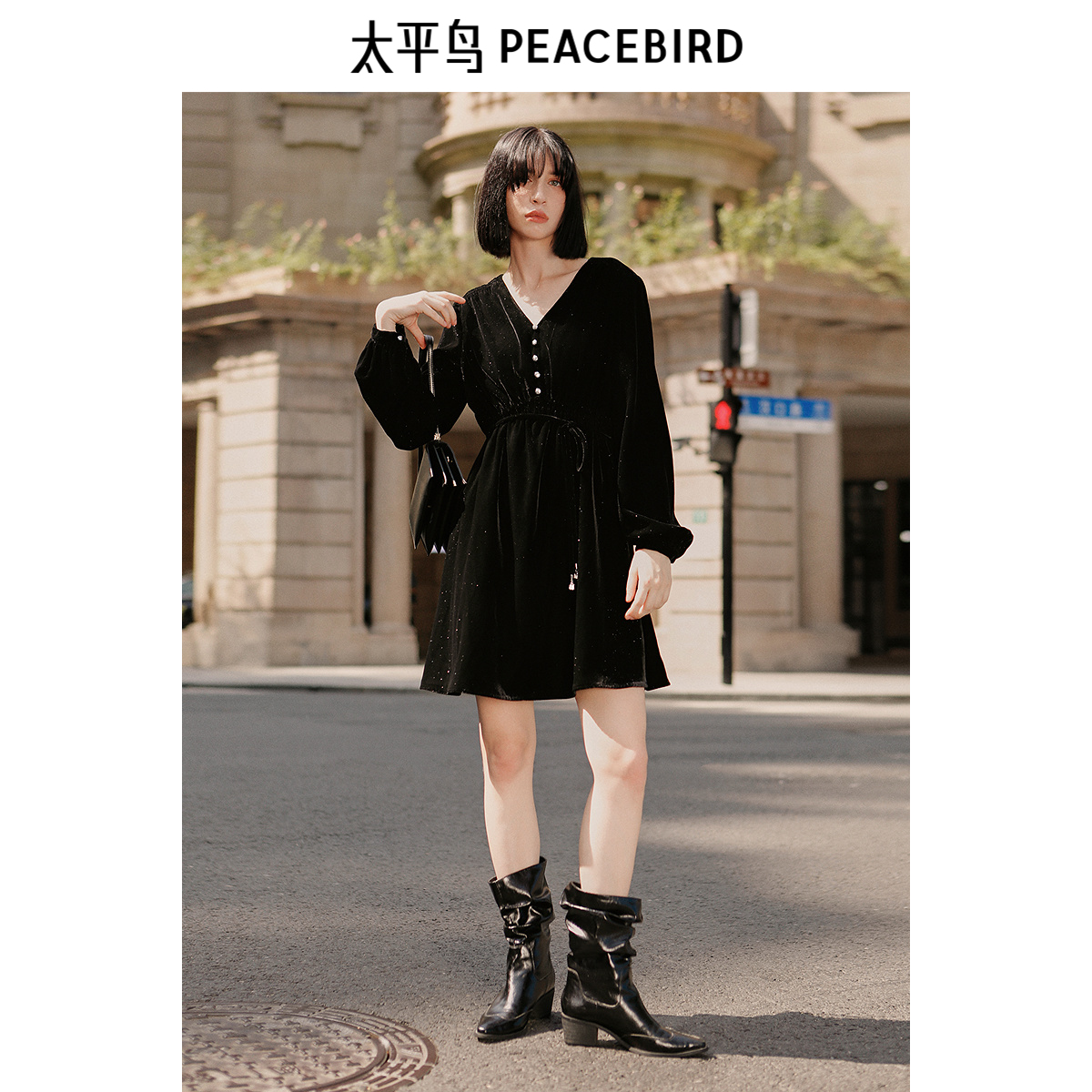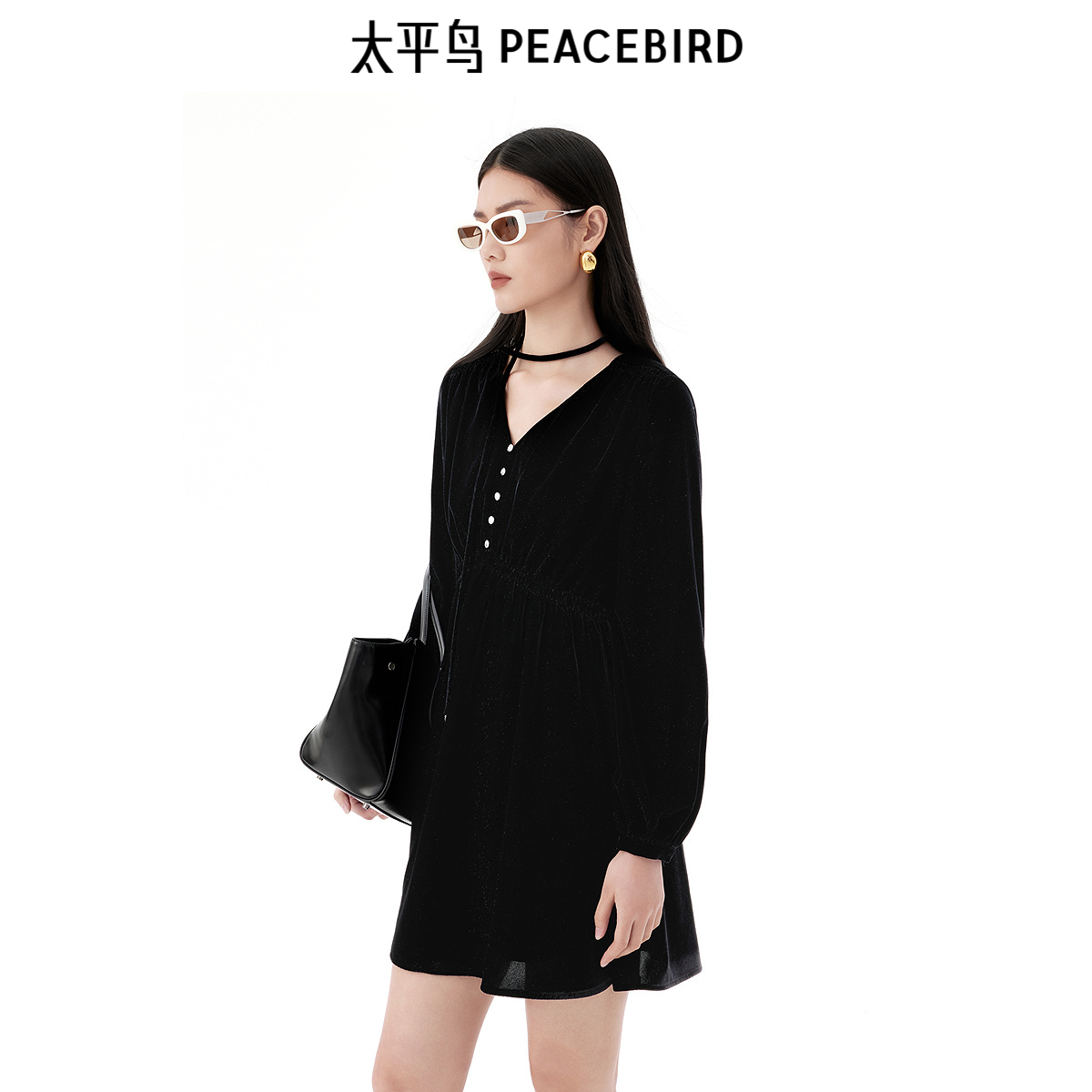 太平鸟女装2025冬季新款细闪丝绒连衣裙A1FAE4609J9