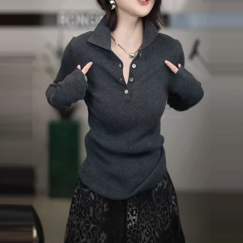 灰色polo领长袖针织衫女2025秋季新款高级感修身内搭翻领打底上衣