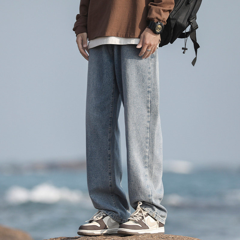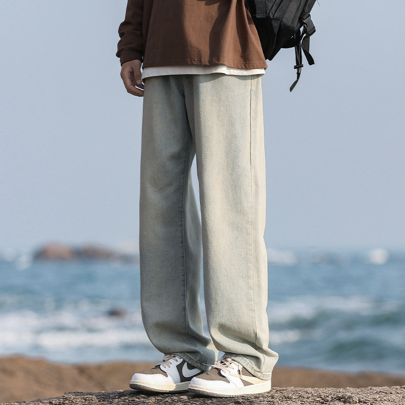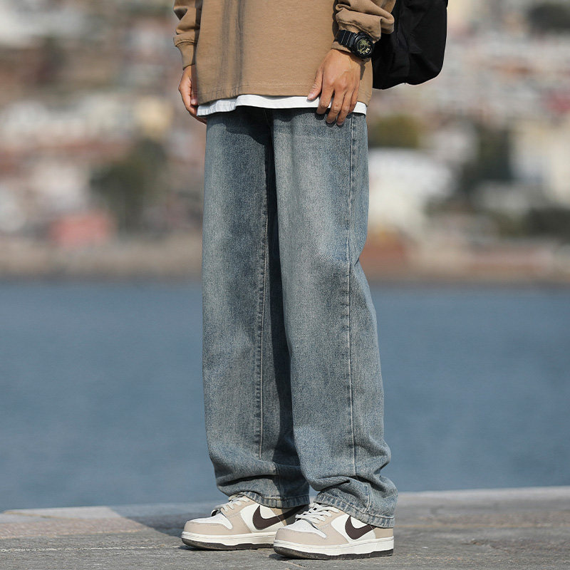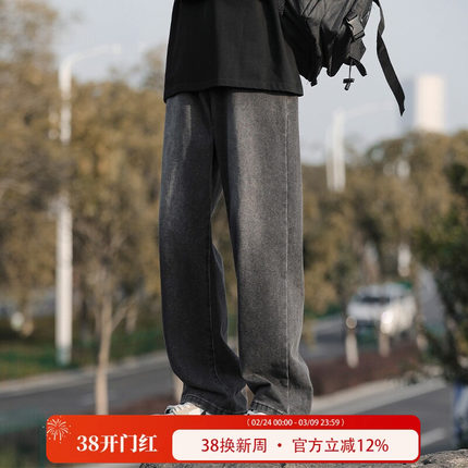 WASSUP BROWN水洗做旧烟灰色牛仔裤男秋季宽松直筒男生休闲长裤
