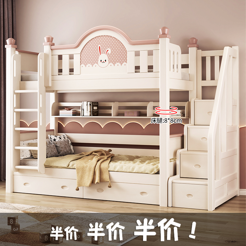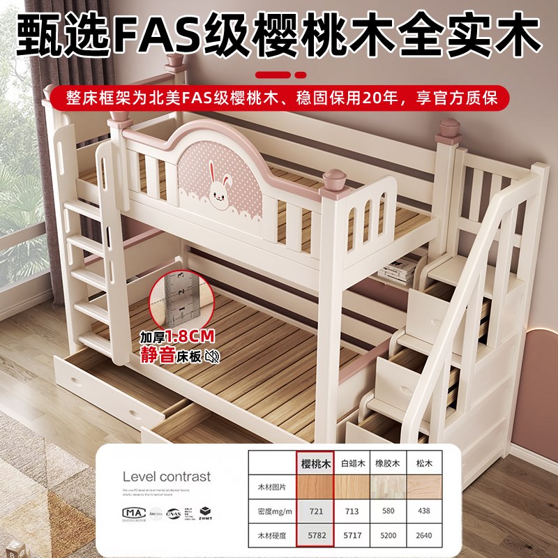 樱桃木上下床同宽儿童高低子母床全实木两层女孩平行上下铺双层床