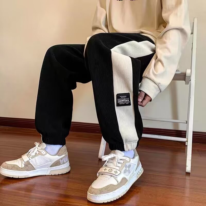 拼色华夫格裤子男春秋季宽松大码潮牌ins港风青少年束脚休闲卫裤